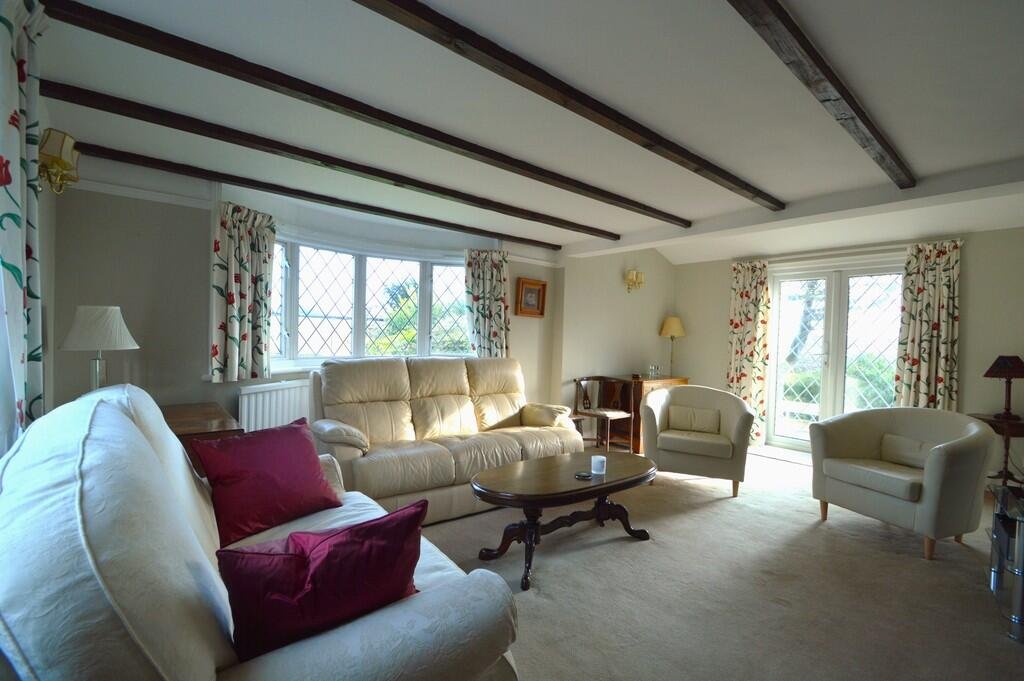 The property is accessed via a part glazed door leading to an impressive reception hall with a feature fire surround, beams to the ceiling, and an attractive recessed cabinet and stairs rising to the first floor. The sitting room is a lovely light room with a triple aspect and stunning views to the