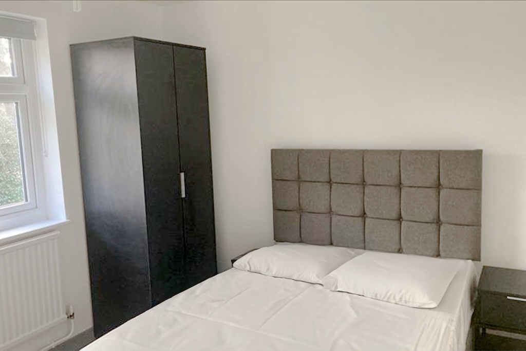 –Bedroom: A cozy en-suite double bedroom furnished with a double bed, wardrobe, bedside table, and chest of drawers for your comfort and storage