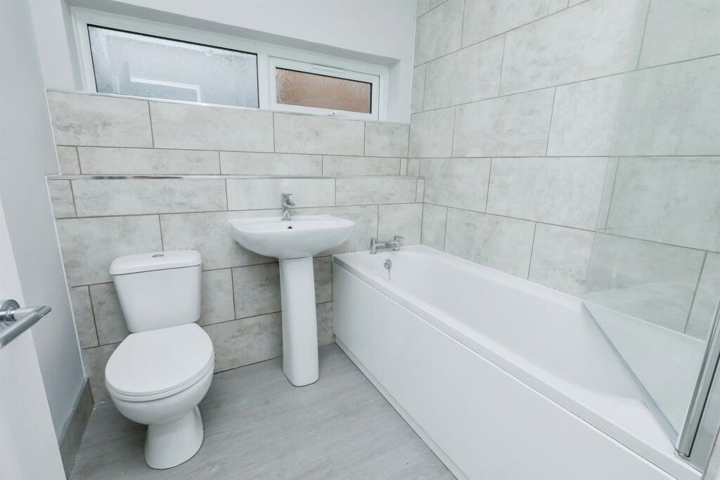 Bathroom Newly fitted bathroom with low level WC, pedestal hand wash basin, panel bath with shower over and complimentary screen. Tiled splashbacks.