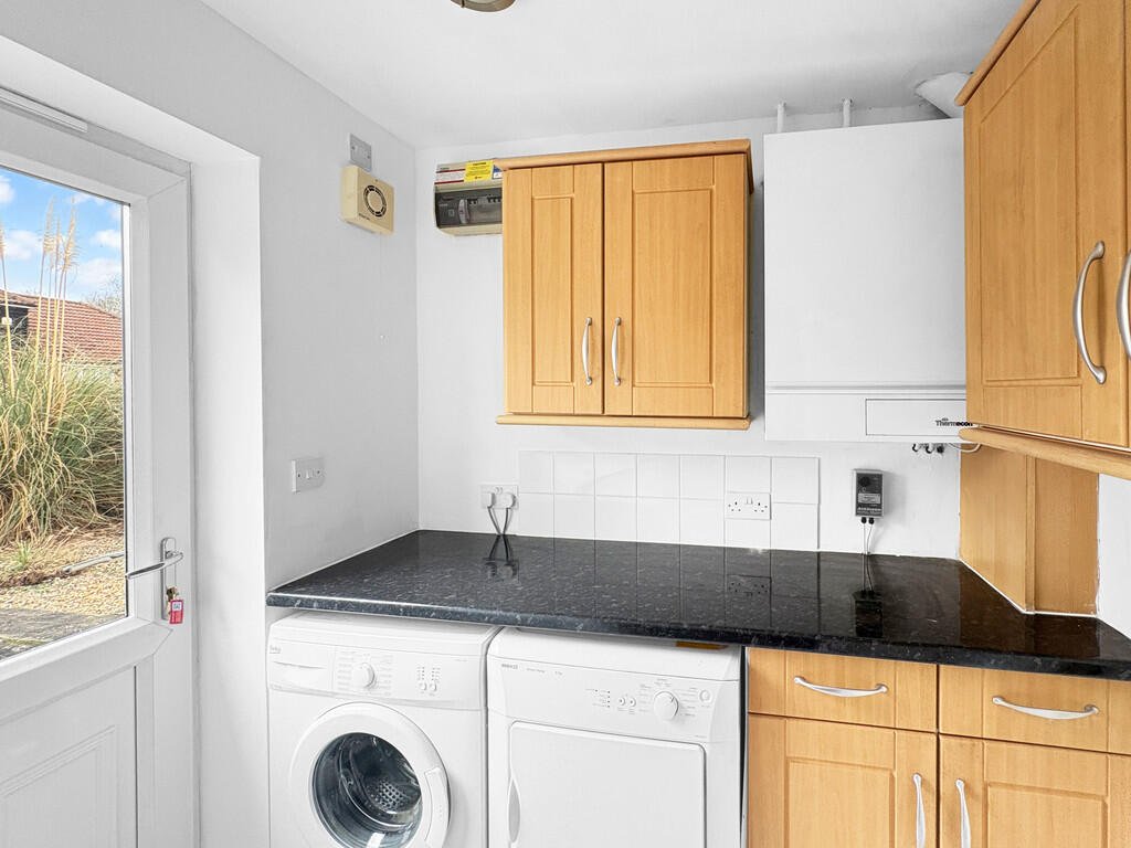 On entering the property, there is a hallway with storage cupboard and a cloakroom with WC. This opens to a light dining room and separate lounge, both of which have access to the garden. The kitchen is well equipped, with hob/oven and fridge/freezer. There is also a utility room with washing machine and a door to the garden.