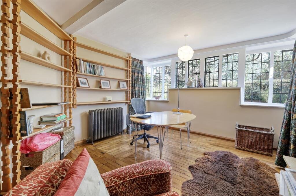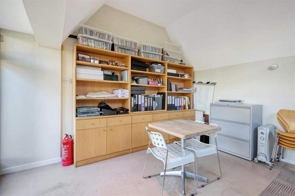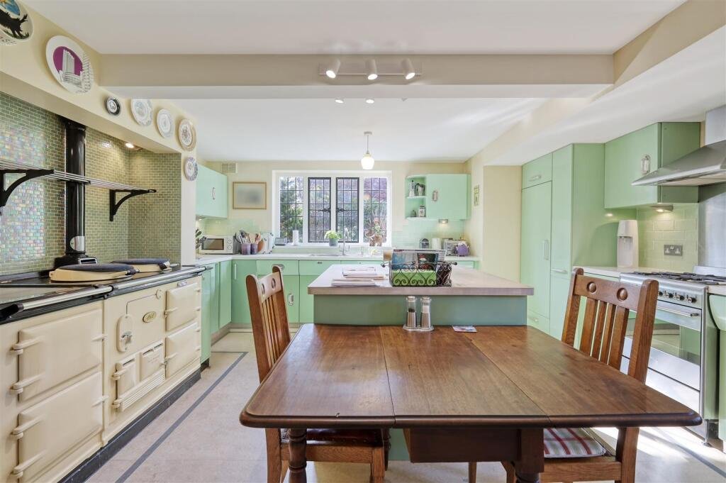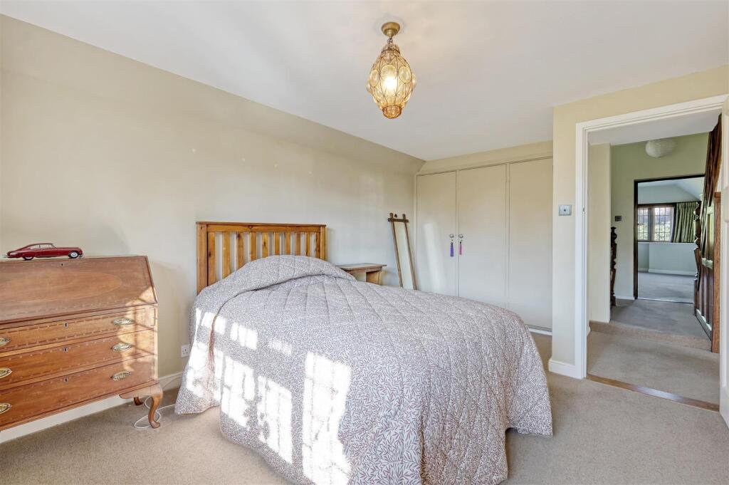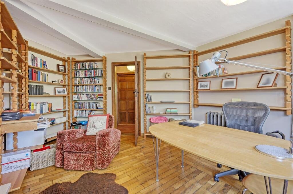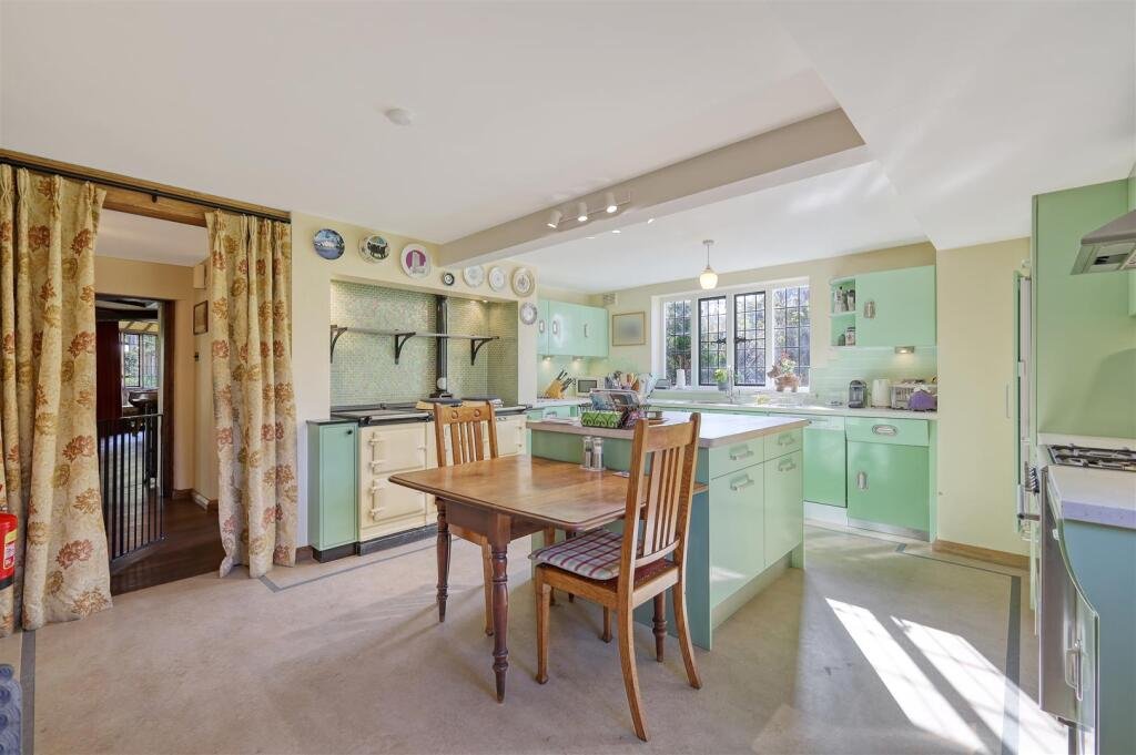 The AGA kitchen/breakfast room is a bright, well-sized space, fitted with restored cabinetry, a central island, gas hob and oven, and an oak stable door to the garden. An elegant sitting/dining room features a striking fireplace with a white stone surround and deep hearth, forming a natural centrepiece. Throughout the reception areas are exposed beams, studwork, oak panelled doors, and wooden floors—hallmarks of Jennings’ signature style. A generously sized study with views over the garden and a practical utility room complete the ground floor.