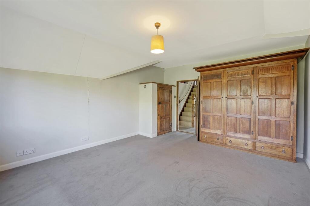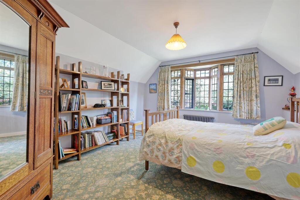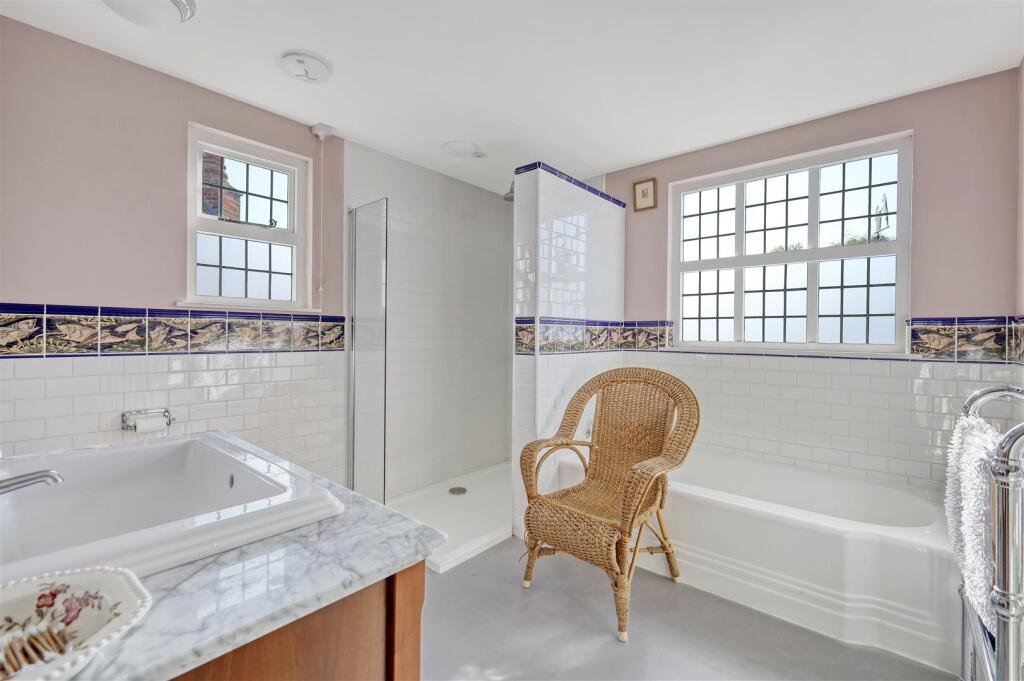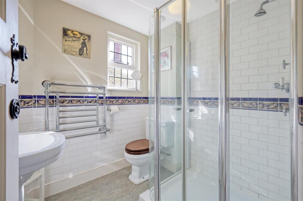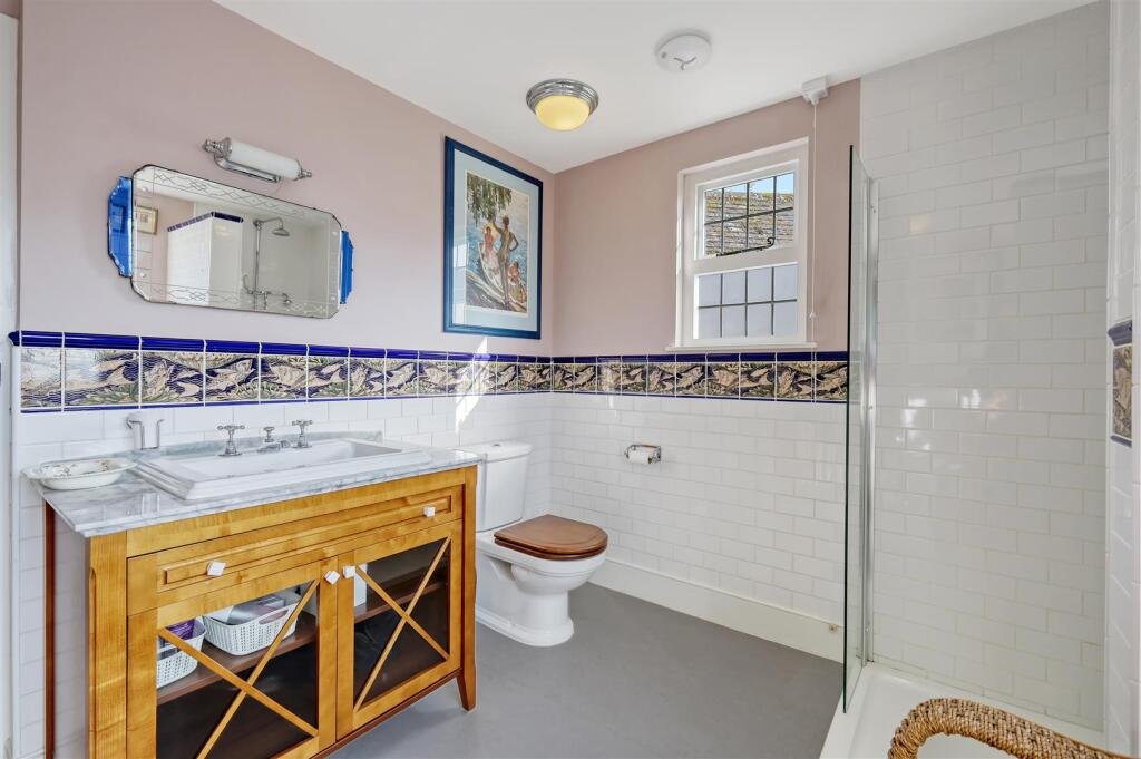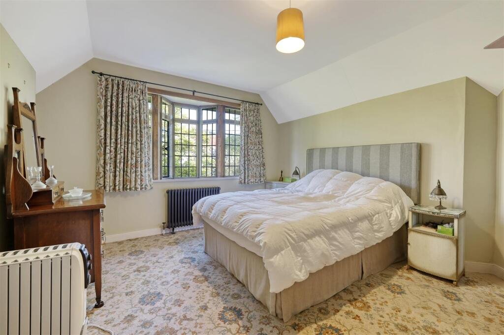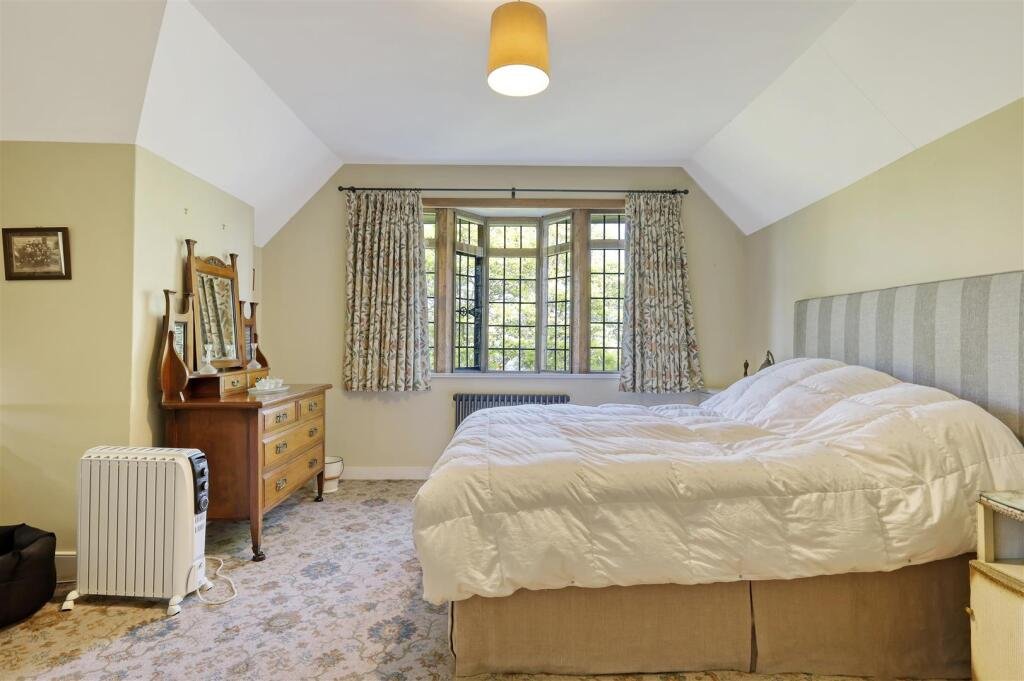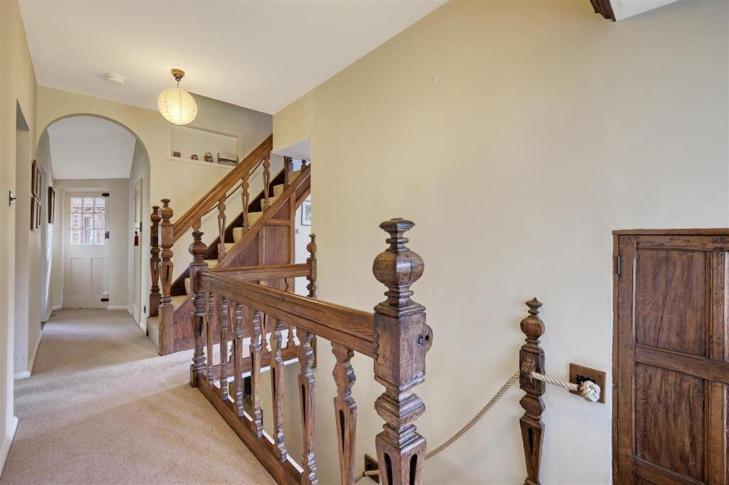 A staircase with beautifully carved handrails leads to the first and second floors. The first floor offers four spacious bedrooms, each with large leaded windows that welcome abundant natural light. The first floor also hosts two bathrooms; one with walk-in shower and the other with a gorgeous bathtub and walk-in shower. The second floor hosts an additional large bedroom with charming views across Walberswick towards the sea.