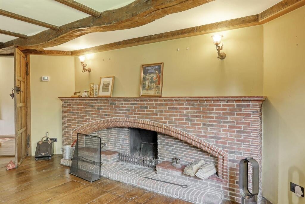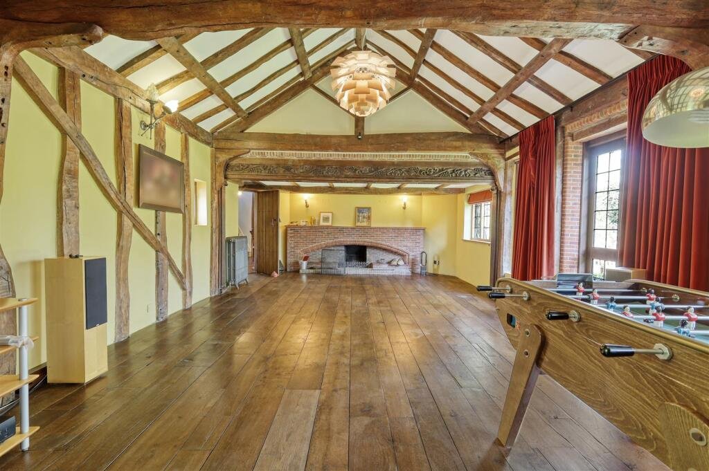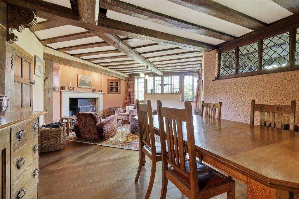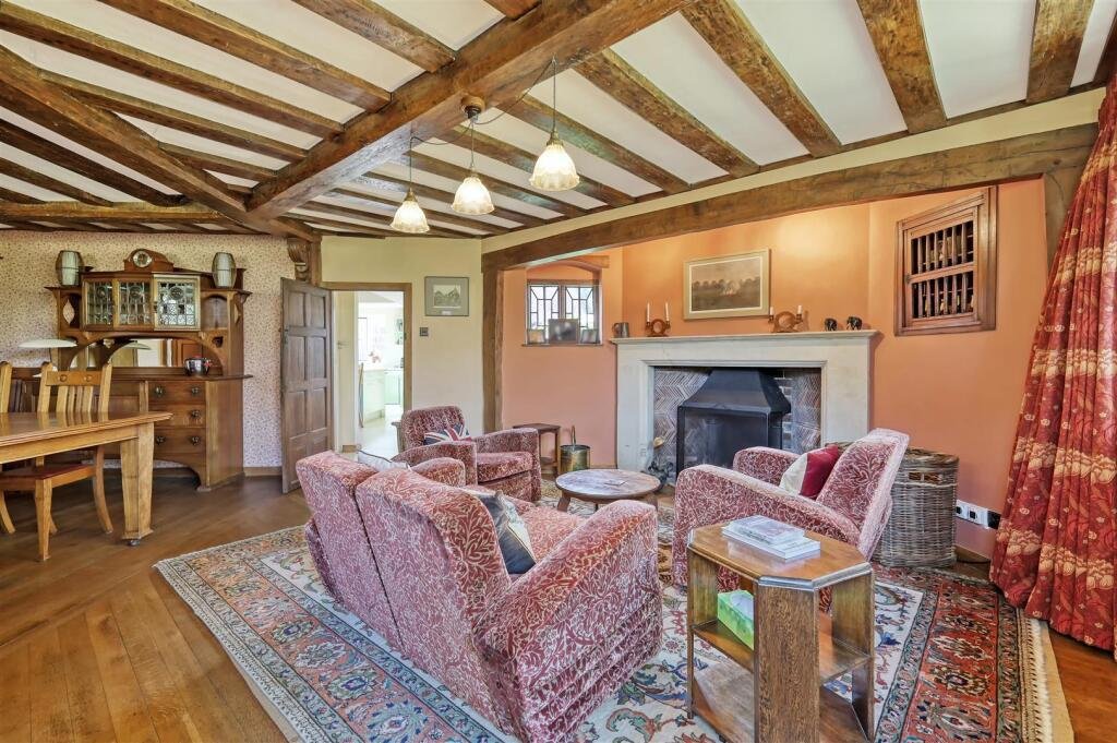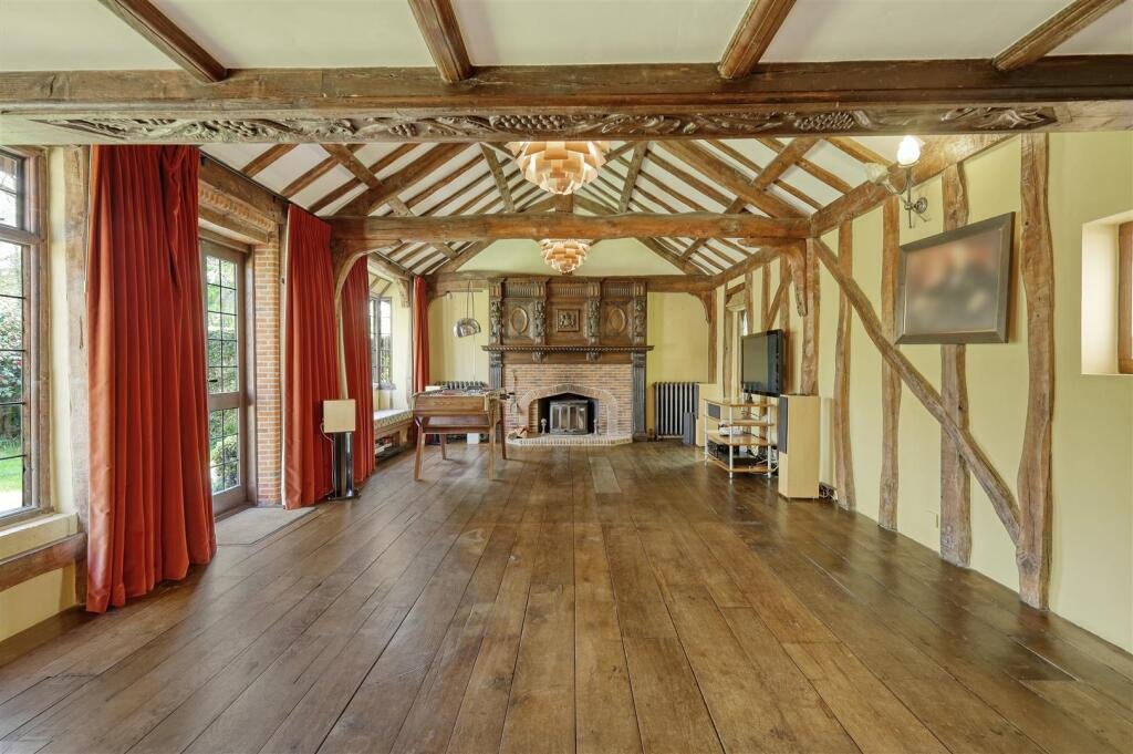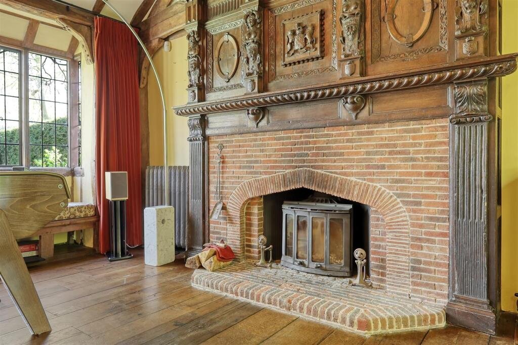 The triple-aspect drawing room is exceptional, distinguished by a soaring vaulted ceiling and medieval oak beams with carved embellishments. Two brick fireplaces anchor the room, one featuring a finely carved wooden mantelpiece originally from the 16th-century palace of the Duke of Norfolk in Harwich, complete with crest. Large windows fill the space with light, while French doors open directly onto the gardens.