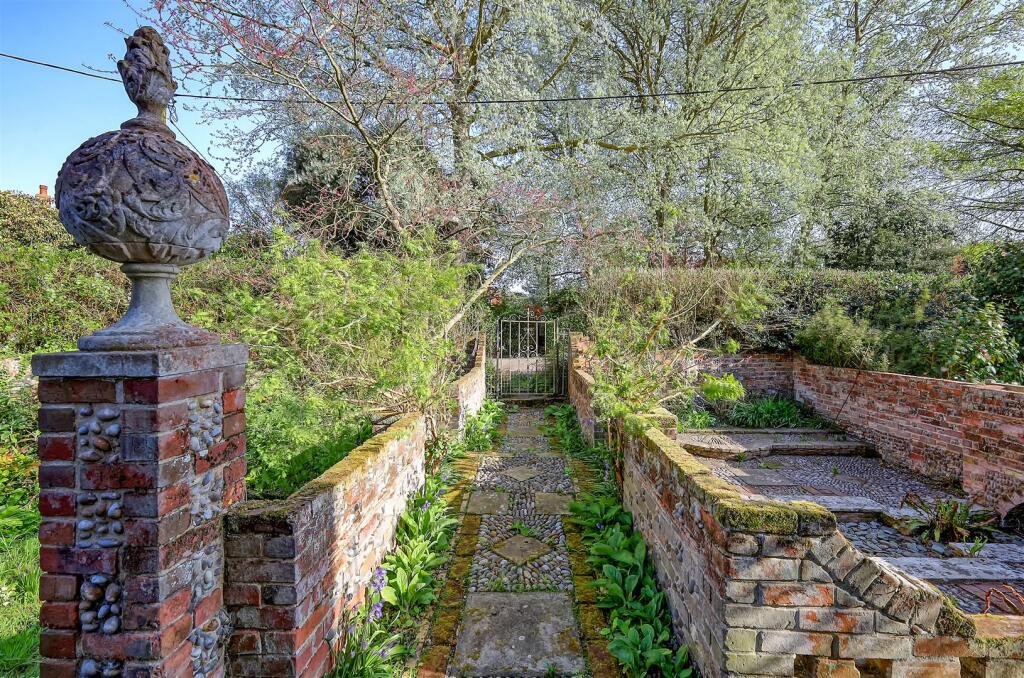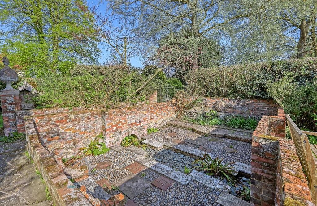 To the east lies a decorative sunken garden with low walls, intricate stone and tile pathways, mature hedging, and a picturesque folly.