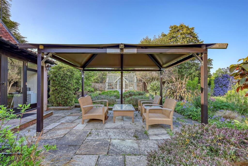 The wider grounds consist of lawns bordered by rich herbaceous planting, a pond set amid a wildflower garden, and an array of mature trees. Paths lead to a large covered terrace framed by lush planting. Nearby stands the garden office, with French windows opening onto the terrace.