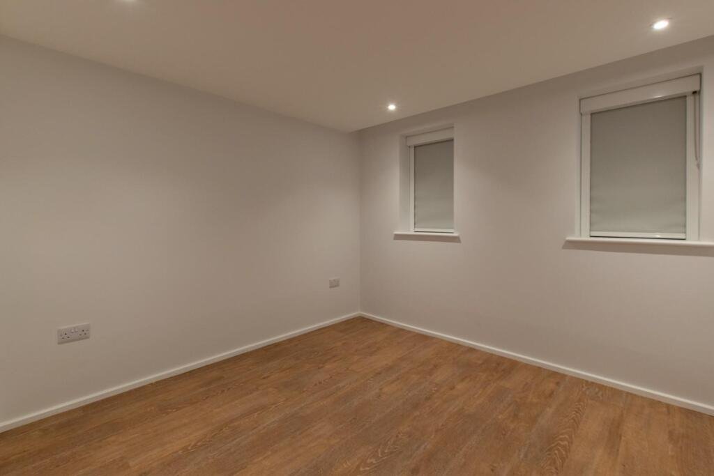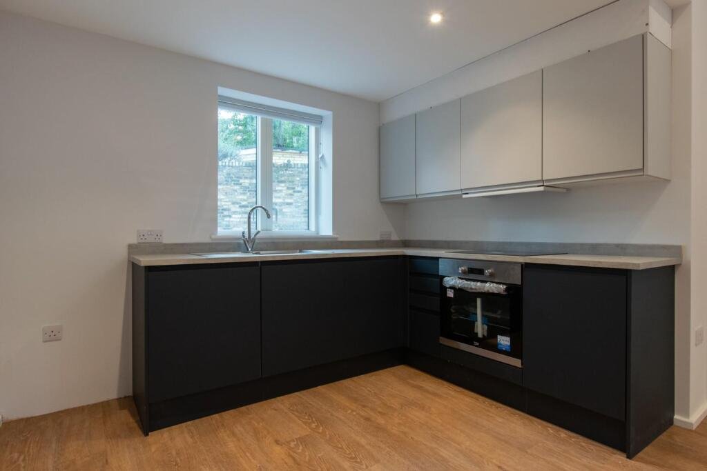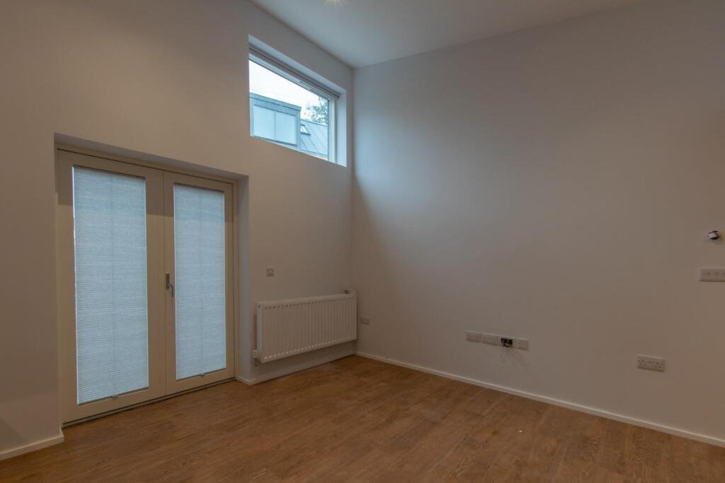 The apartment itself is unfurnished and finished to an exceptional standard. The impressive open-plan living area features a vaulted ceiling and French doors, creating a bright and airy space ideal for both relaxing and entertaining. There is a well-proportioned double bedroom and a stylish, modern shower room designed with a sleek contemporary finish.