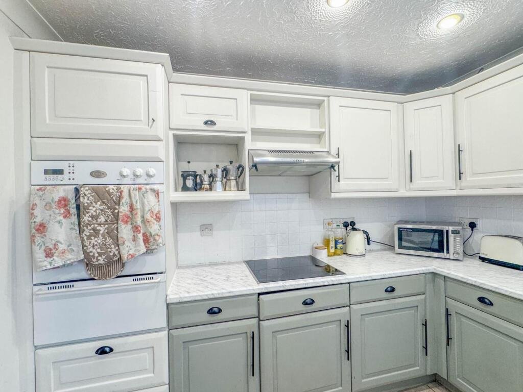 The ground floor comprises a spacious open-plan living and dining area, creating a versatile layout suited to modern living. The separate kitchen is positioned to the rear and benefits from ample cupboard storage and worktop space, ensuring functionality for everyday use.