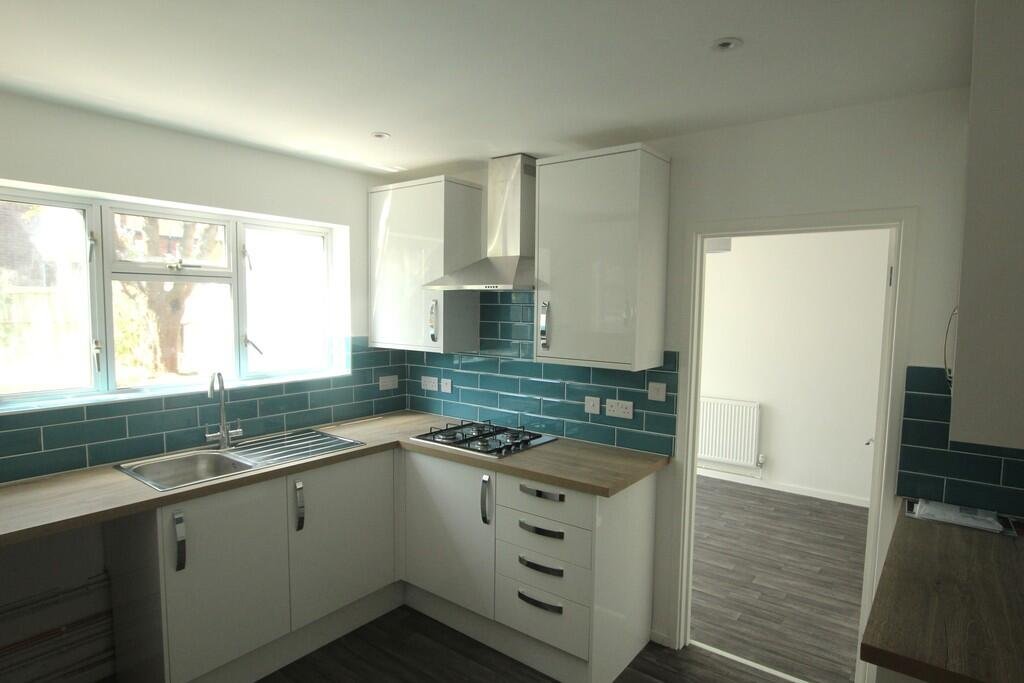 KITCHEN 12′ 1″ x 9′ 11″ (3.7m x 3.03m) Double glazed window to rear aspect, range of base and wall mounted units with work surfaces over, integrated gas hob with extractor fan over, stainless steel sink and drainer unit with mixer tap over, splash back tiling. White good NOT Included.Â