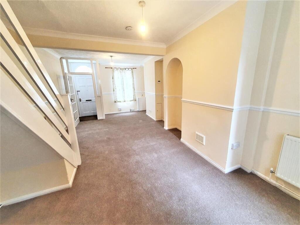 Sitting/Dining Room – 6.90 x 3.61 (22’7″ x 11’10”) – with stairs leading to first floor, under stairs storage cupboard, 2 radiators, windows to front and rear aspects.