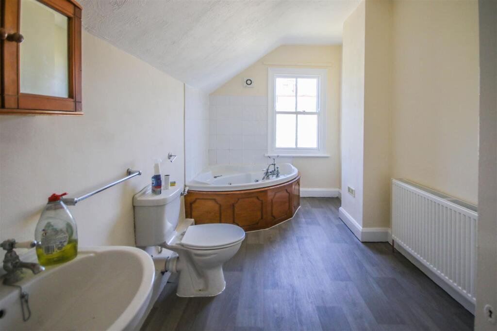 Bathroom – with large bath with mixer tap and shower attachment over, pedestal hand basin, low level WC, tiled splashbacks, radiator, extractor fan, built-in cupboard, window to rear aspect.