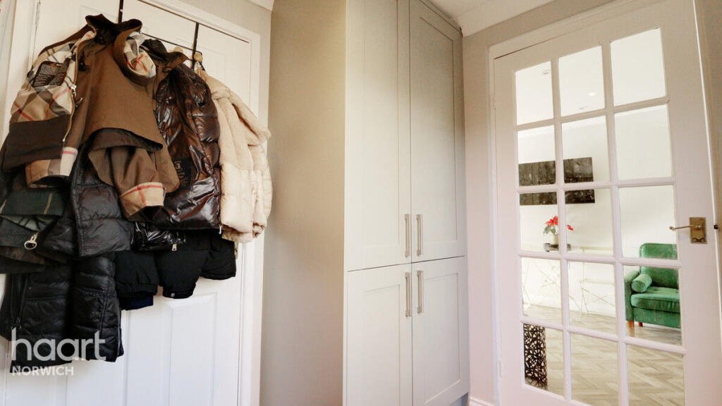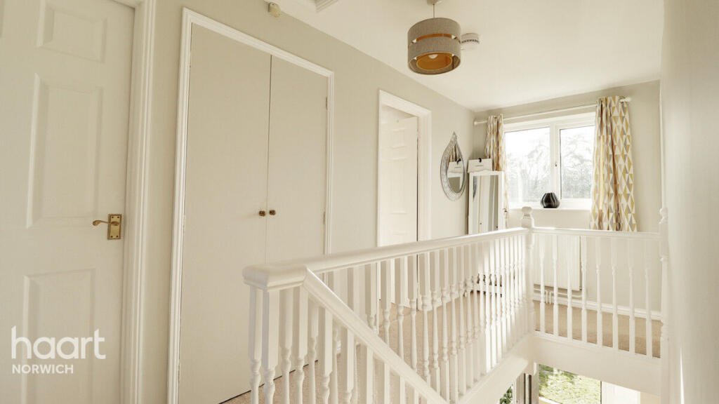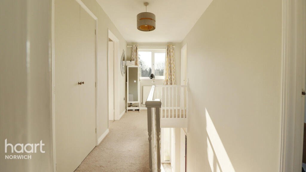 Upstairs, the property comprises four well-proportioned bedrooms — three doubles and one generous single bedroom that can accommodate a small double bed. All bedrooms benefit from built-in wardrobe space, maximising living space and storage. A family bathroom completes the first floor. On the landing a large double airing cupboard for further convenience storage.