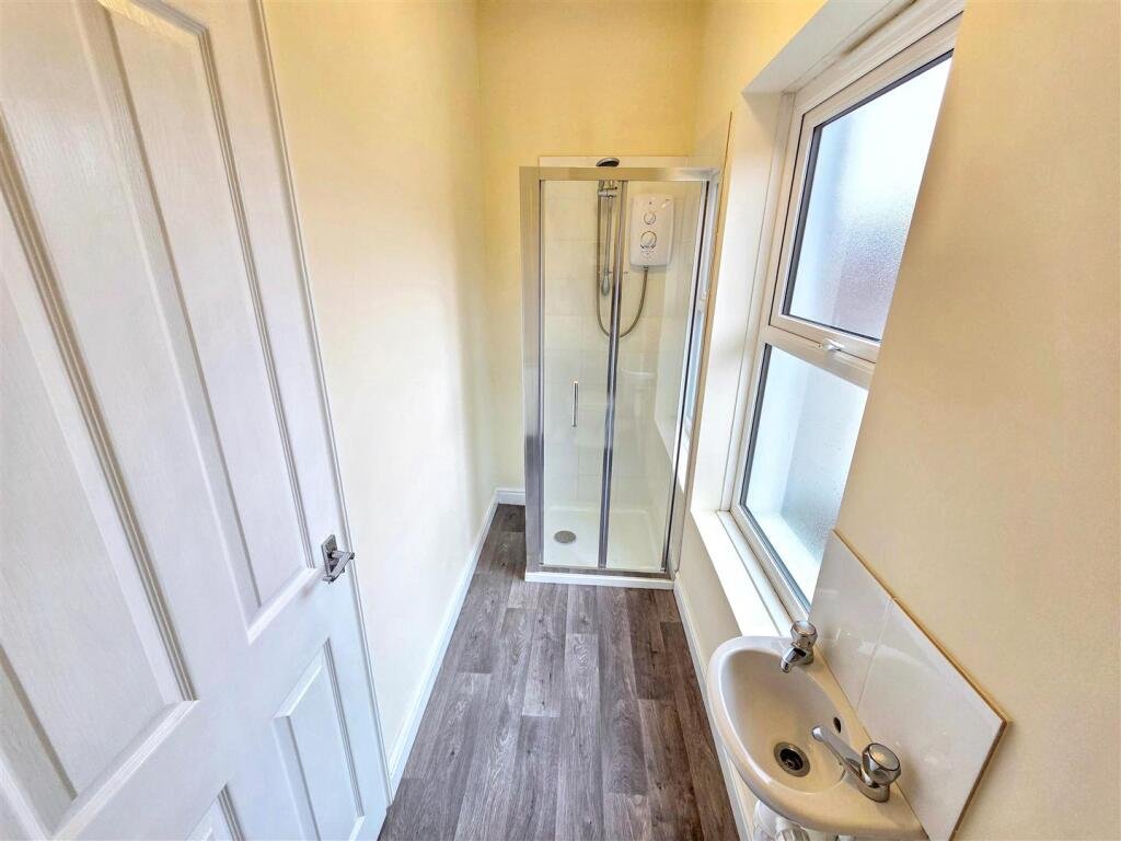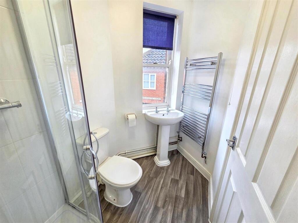 Shower Room – max 1.37m x 2.46m (max 4’06 x 8’01 ) – Sash window, grey wood effect vinyl floor, WC, pedestal wash basin, mains shower and heated towel rail.