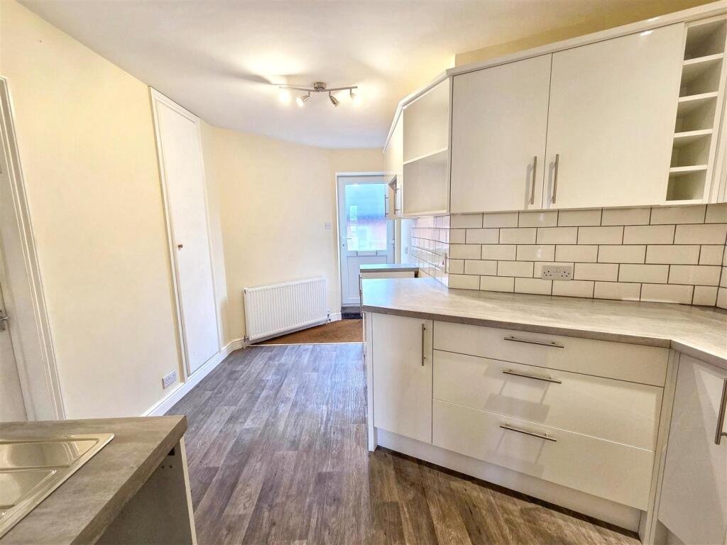 Kitchen – max 3.33m x 4.22m (max 10’11 x 13’10) – uPVC front door, grey wood effect vinyl, 1 radiator, a range of white base and wall units. Door to shower room.