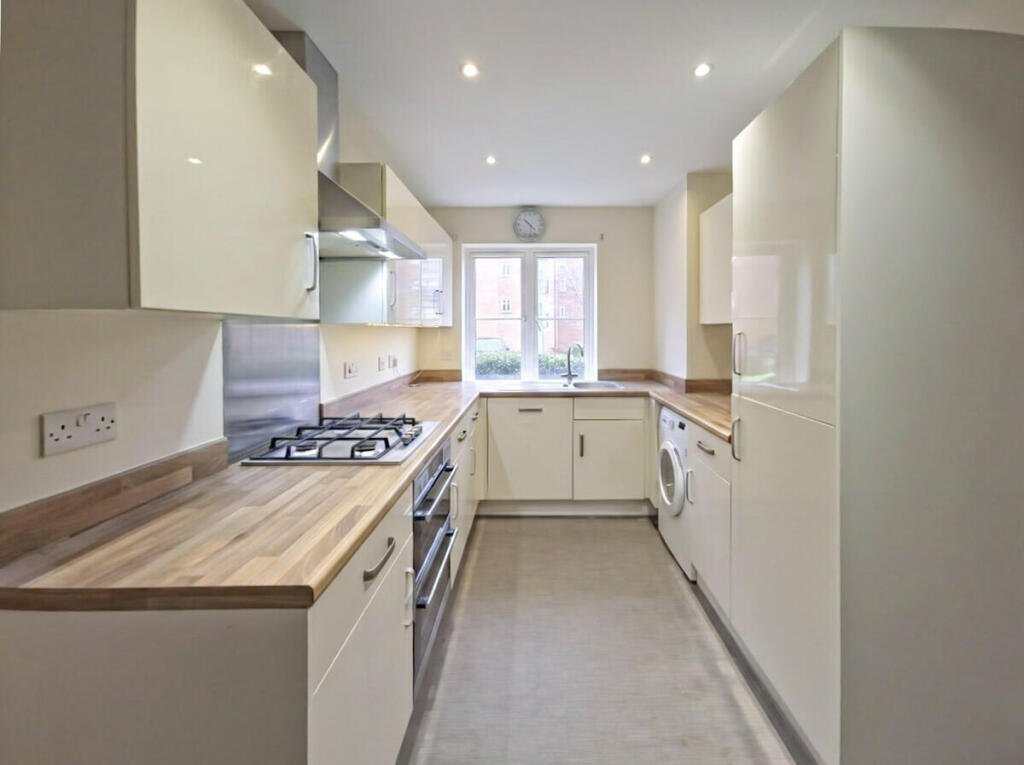 kitchen and diner. This kitchen offers tiled flooring, ample storage within modern base and wall units, and built-in appliances including an oven, gas hob, washing machine, and fridge freezer, alongside plenty of space for a breakfast table. To the rear, the spacious lounge is finished with smart wood-effect flooring. It includes a practical under stairs storage cupboard and uPVC double patio doors that flood the room with natural light and open directly into the courtyard.