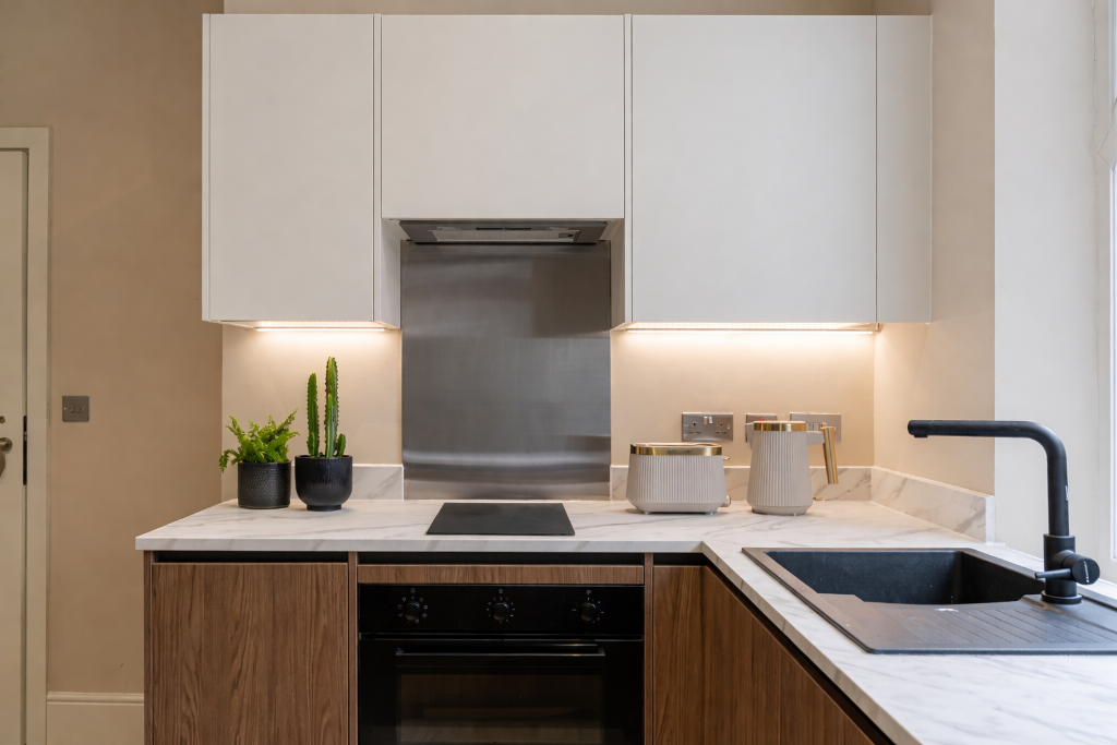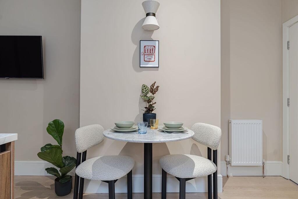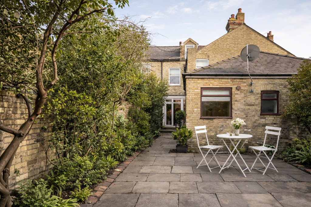 The modern kitchen is fully equipped and thoughtfully arranged, complete with dining table and everything required from day one. Pots, pans, cutlery, crockery and glassware are all included, allowing for a seamless move-in experience. From here, doors open directly onto a private rear courtyard garden – a rare and valuable addition in such a central Cambridge location.