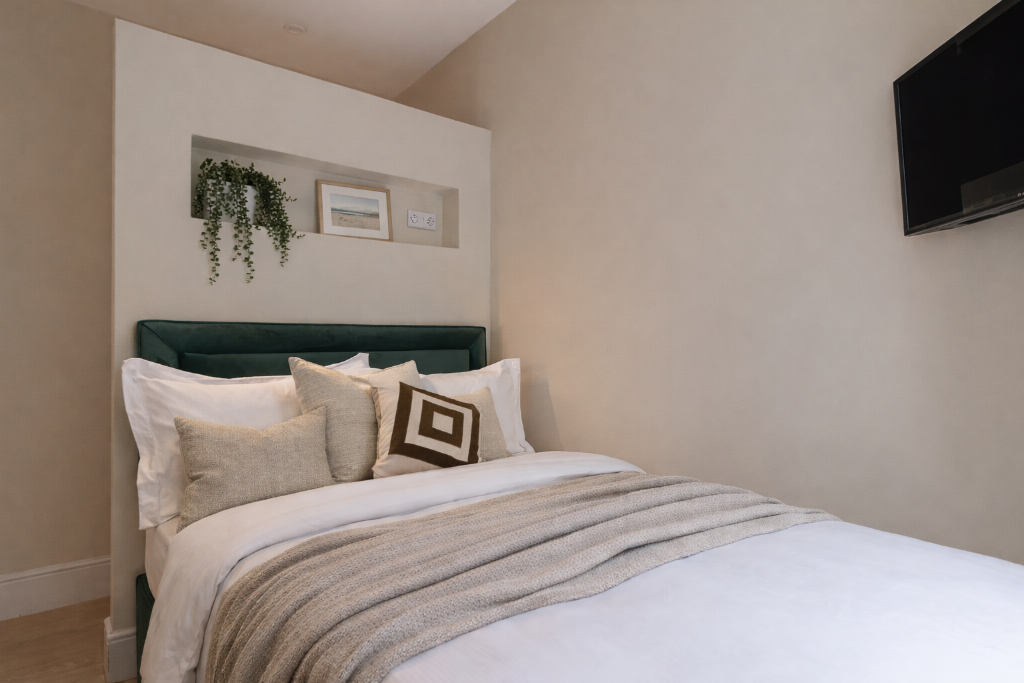 The bedroom is quietly positioned and generously appointed with a luxurious king-size bed and ample storage via triple wardrobes and drawers. A second smart TV adds flexibility and comfort.