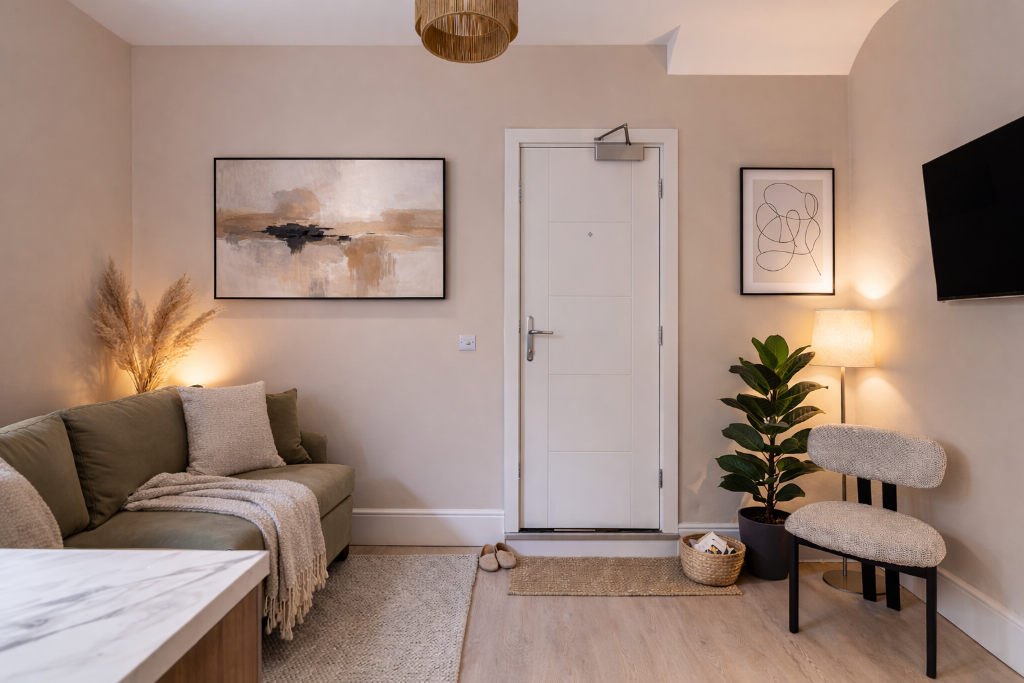 This home blends period character with a clean, modern finish. From the moment you enter, the double-height ceilings create a wonderful sense of volume and light, giving the apartment a calm, airy feel rarely found in city centre living.