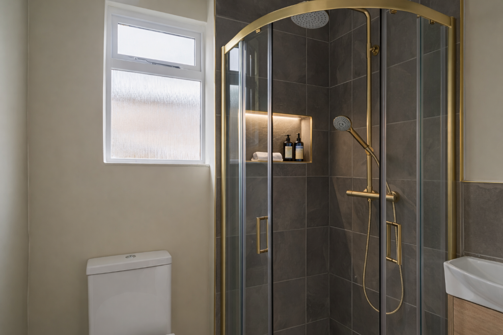 The contemporary bathroom is finished with clean lines, quality fixtures and premium detailing, complementing the apartment’s refined aesthetic.