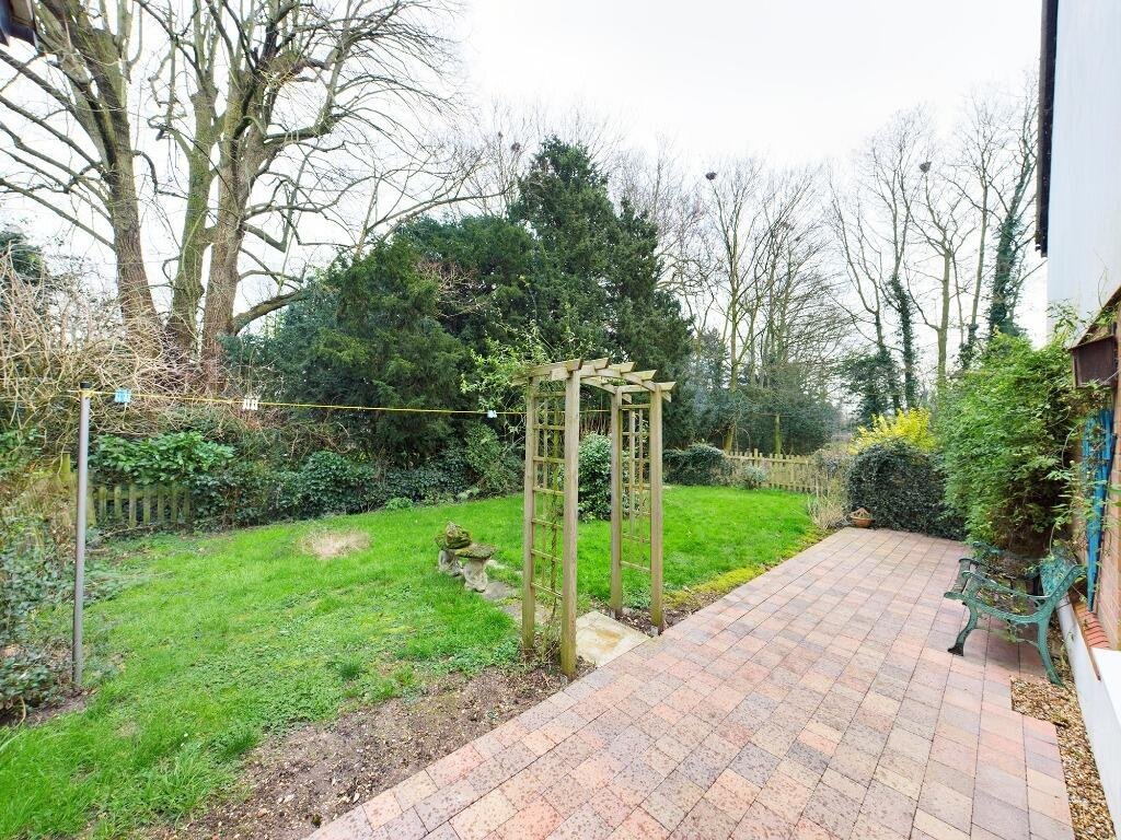 garden, predominantly laid to lawn, accessible via both the living room and a side gate — ideal for enjoying outdoor space in a quiet setting. Further advantages include modern electric heating, an en-bloc garage, and off-road parking.