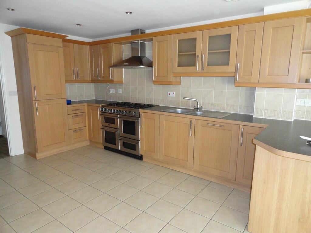 KITCHEN 14′ 11″ x 12′ 6″ (4.55m x 3.81m) With Range Cooker, Dishwasher , Dryer and space for Washing Machine.Â