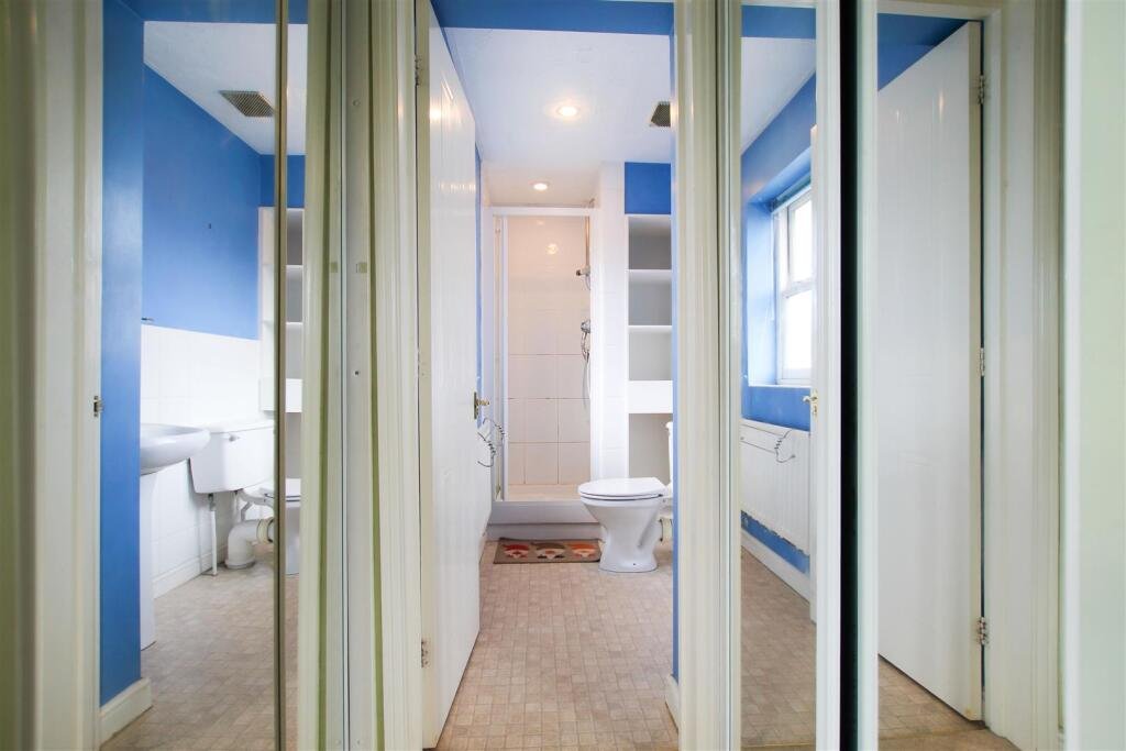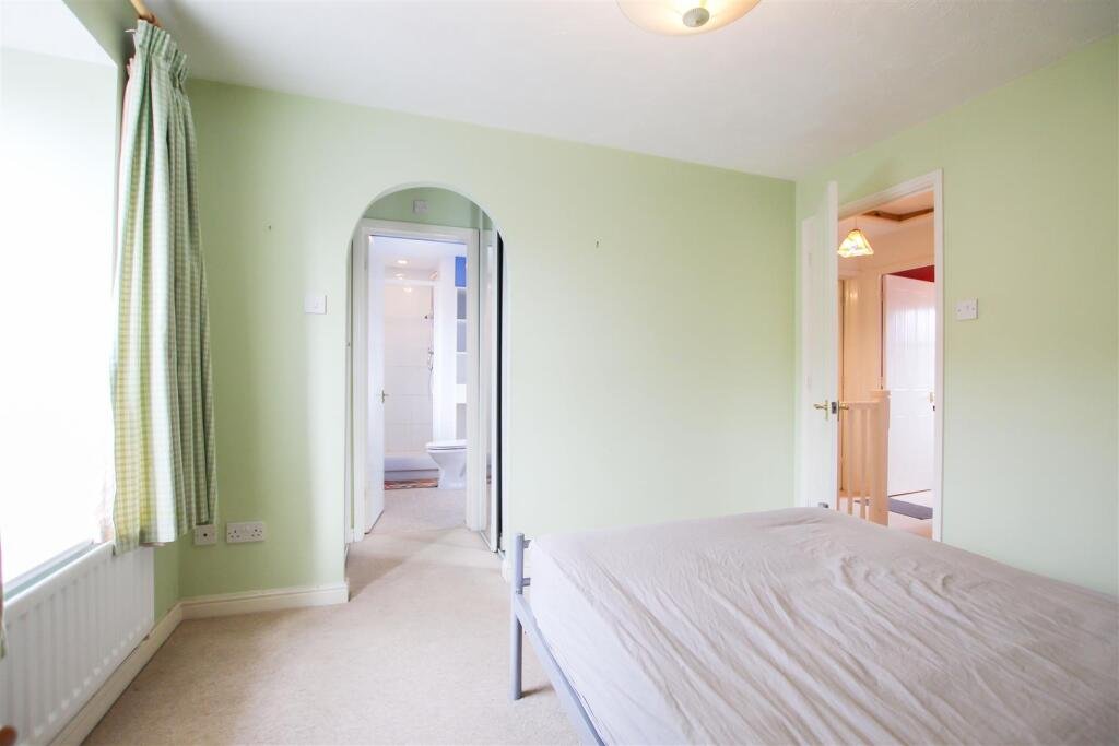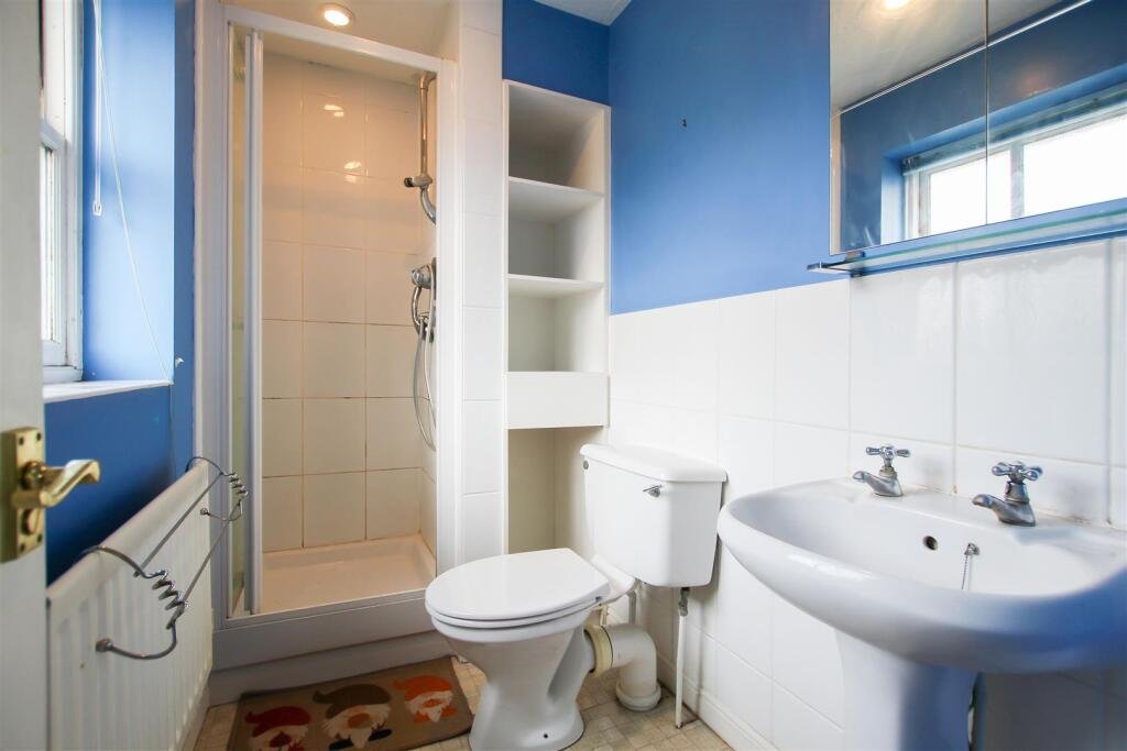 En-Suite Shower Room – shower enclosure, fitted shelving to recess, wc, wash basin with mirror above and window to front aspect with obscured glass.