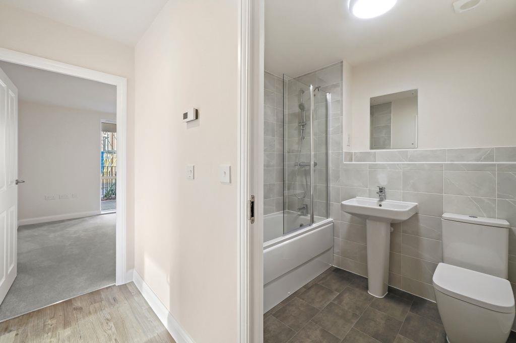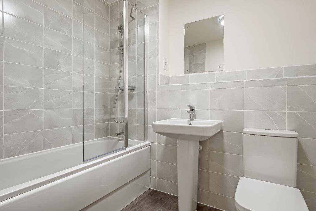 Bathroom – shower over bath with glass shower screen, wc, and wash basin with mirror above.