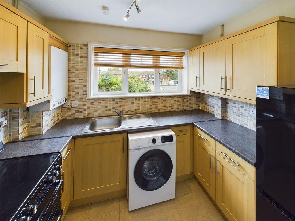 Council Tax Band A. EPC: C-74. A 1st floor flat set in an off road position. Kitchen with white goods comprising, free standing electric double oven, washing machine & fridge freezer. Double bedroom with built-in wardrobes and cupboards. Bathroom with white suite and shower over bath. Lounge with windows at both apex and balcony over looking green area. Outside store cupboard along with parking space. Please see photo’s for floor plan dimensions.
