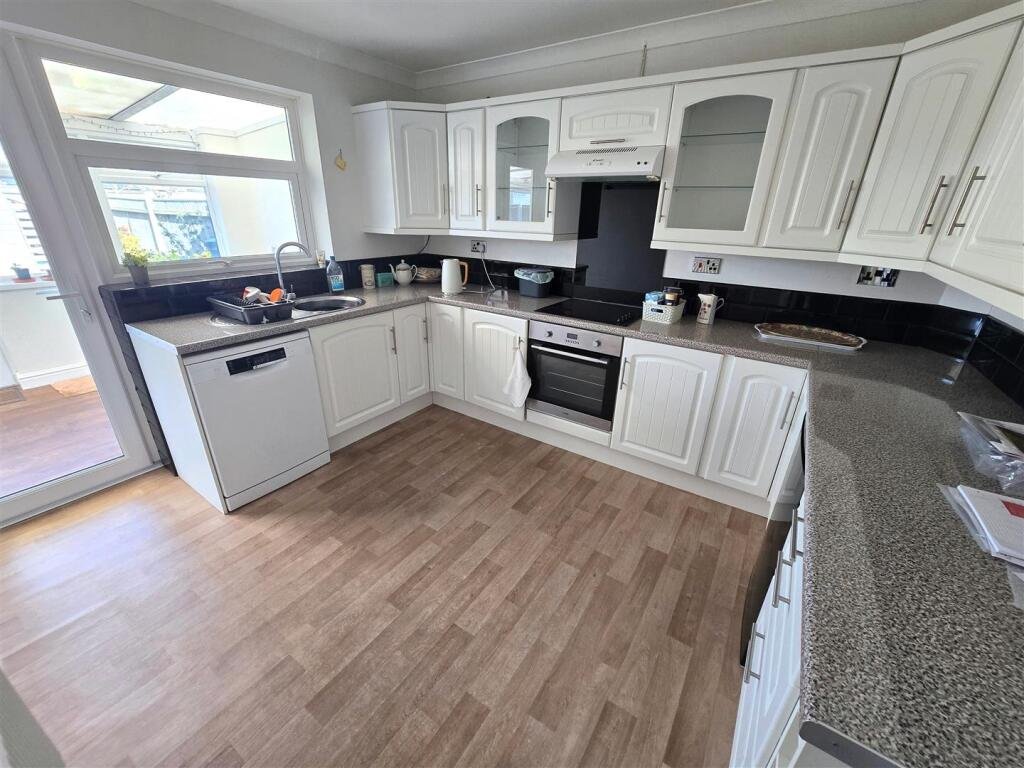 Kitchen – 3.88 x 3.68 (12’8″ x 12’0″) – Timber effect vinyl flooring, a range of modern fitted kitchen units with extended work surfaces, built in stainless steel electric oven with matching four burner ceramic hob, glass splashback, extraction cooker hood, recess for white goods including plumbing for a dishwasher, round bowl stainless steel sink, radiator, space for breakfast table and chairs if required, uPVC window, uPVC door leading to:-