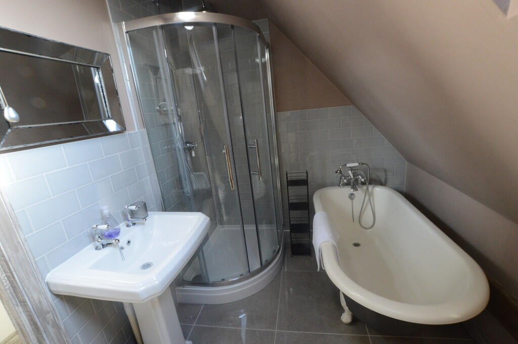 BATHROOM A well-appointed bathroom with tiled flooring, a corner shower cubicle, separate roll-top bath, heated towel rail, WC, and sink.