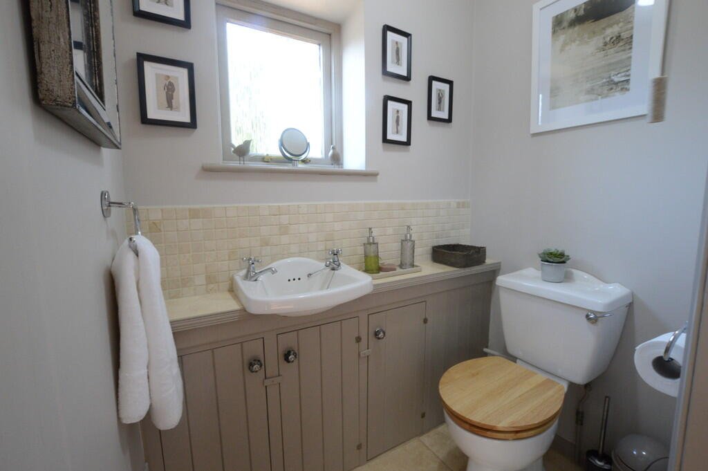 CLOAKROOM A convenient cloakroom with tiled flooring, a vanity sink, and WC.