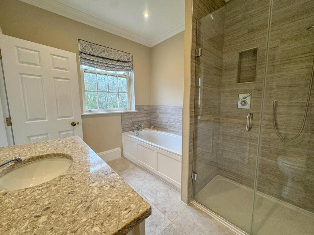 En-Suite – Comprising WC, vanity wash hand basin, double shower cubicle, bath, heated towel rail, and window to the side aspect.