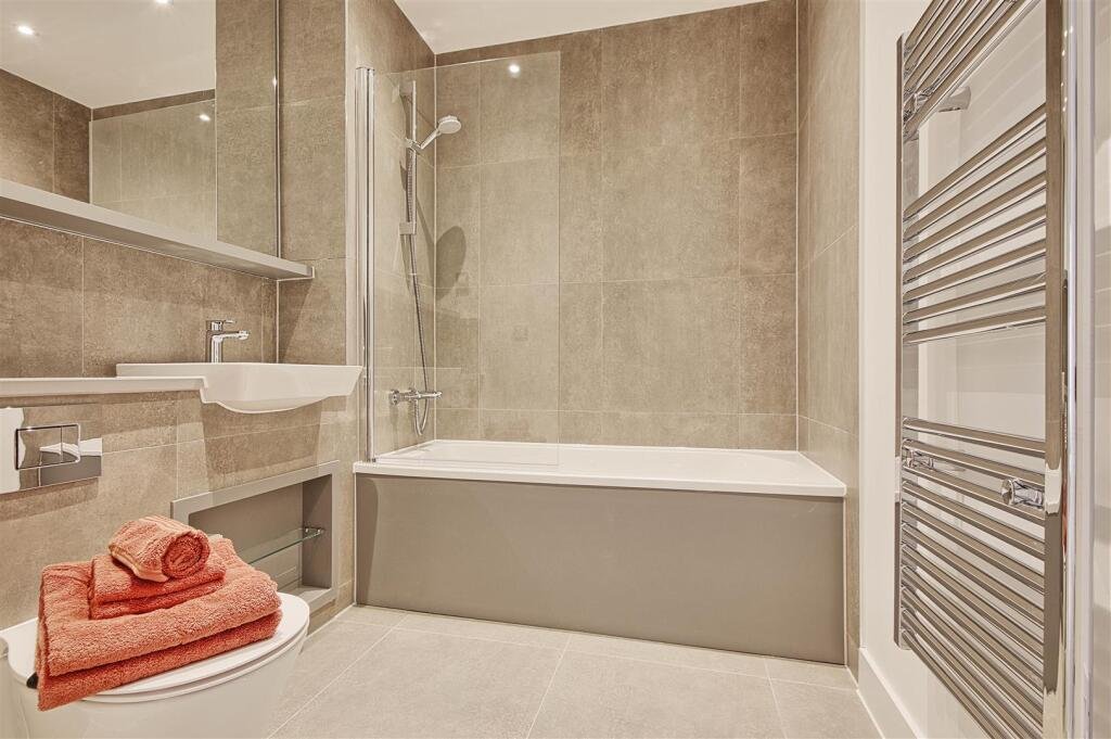 Upon entering the property, you are welcomed into the hallway which is L shaped with grey wooden style flooring and crisp white walls. The first room you come to next to the front door is the main bathroom. With grey concrete effect wall and floor tiles, within the bathroom there is a bath with an overhead shower and glass screen, a countertop hand basin with open shelving underneath, low level W.C. and a stainless steel coloured heated towel rail. The bathroom also has a large mirror above the W.C. and a hand basin which bounces light around the room. Next to the main bathroom is bedroom one. With dual aspect full length windows, the master is a bright and relaxing space with built-in wardrobes with double glass sliding doors. Bedroom one also has the added bonus of an en-suite which has a walk-in shower cubicle with glass door, low level W.C, countertop hand basin with open shelving underneath and a stainless steel coloured heated towel rail. Next to bedroom one is bedroom two. Another great sized double, bedroom two enjoys a full length window flooding the room with light and has ample space for storage furniture as required.