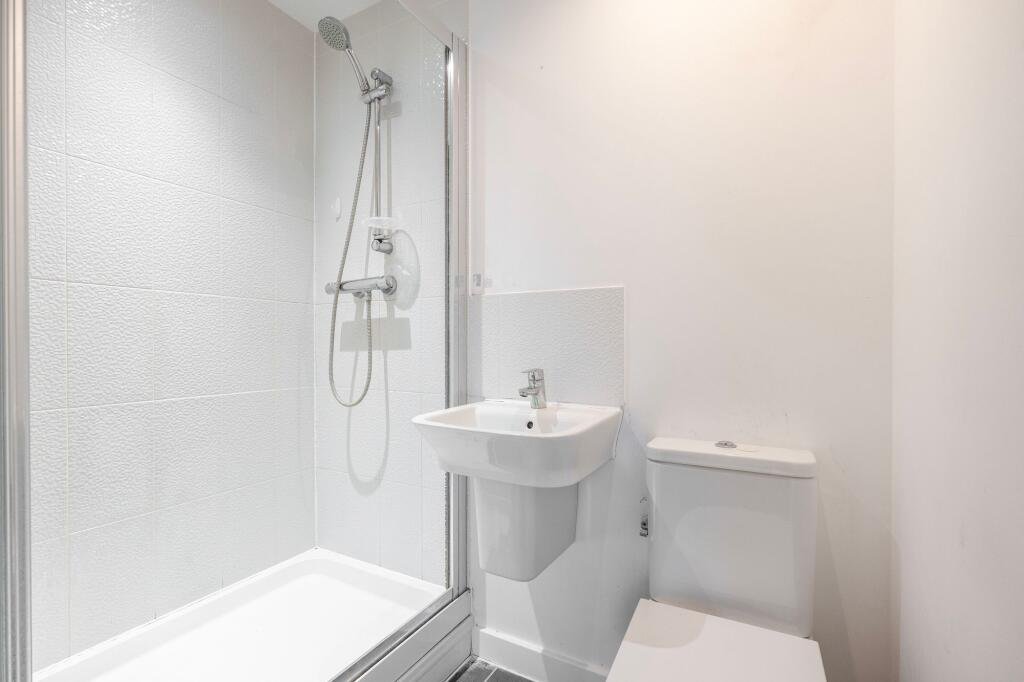 The main bathroom is finished to a modern standard and includes a panelled bath with a shower over, a wash basin, and a WC, complemented by tiled flooring and clean wall finishes.