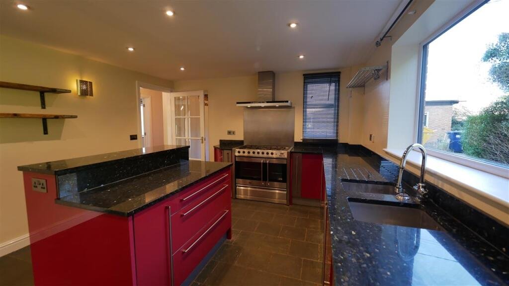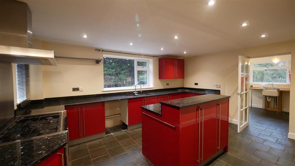 Kitchen 4.85m (15’11”) x 3.71m (12’2″)Range of matching red units with worktop space and island unit. Range-style cooker. Space for dishwasher and fridge/freezer. Natural stone flooring