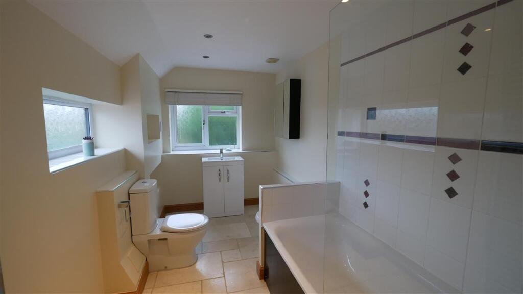 Bathroom White three piece suite with wc, bath with shower over and vanity basin. Heated towel rail. Natural stone flooring