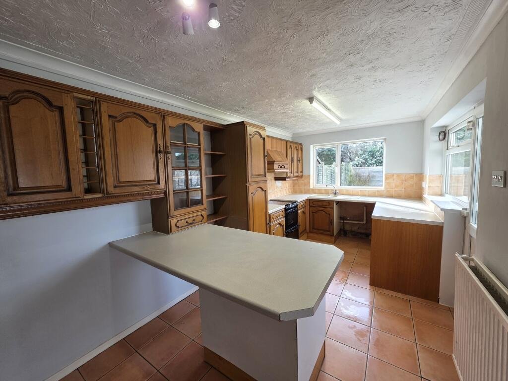 Kitchen 17ft4 x 8ft4 – Tiled flooring, range of fully fitted wooden wall and floor units, worktop including breakfast bar, electric cooker with extractor fan above, tiled splashback, inset sink with drainer beneath window to