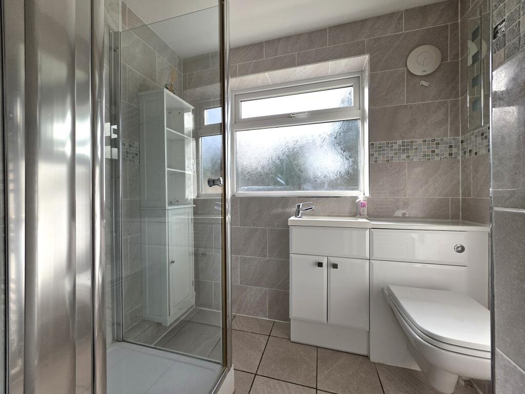 Bathroom – Fully tiled, window to rear with privacy glass, modern white suite including sink with vanity unit beneath, WC and glass corner shower enclosure with electric shower, chrome heated towel rail, mirrored medicine cabinet.