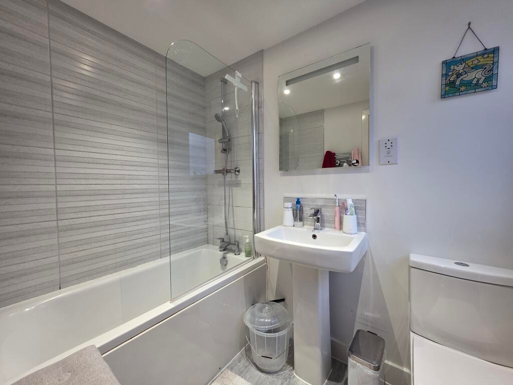 Bathroom With modern white bathroom suite including over-bath shower, glass shower screen, WC and basin and heated towel rail.