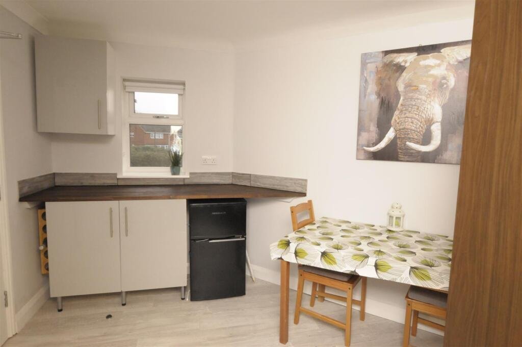 Room comprises of double bed, black out blinds and curtains, built in wardrobe, two book cases, full length mirror, dining area with table and chairs, built in kitchen cupboards and fridge freezer.