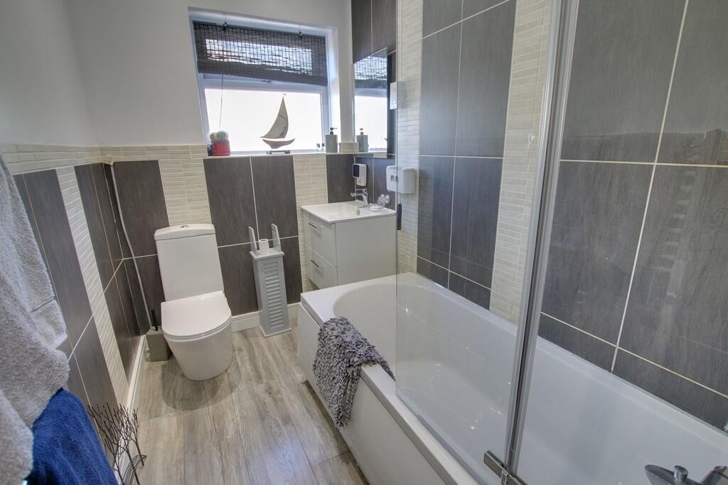BathroomFitted with a three piece suite comprising bath with shower over, vanity wash hand basin and WC, heated towel rail, double cupboard, window to side, access to loft with light and ladder.
