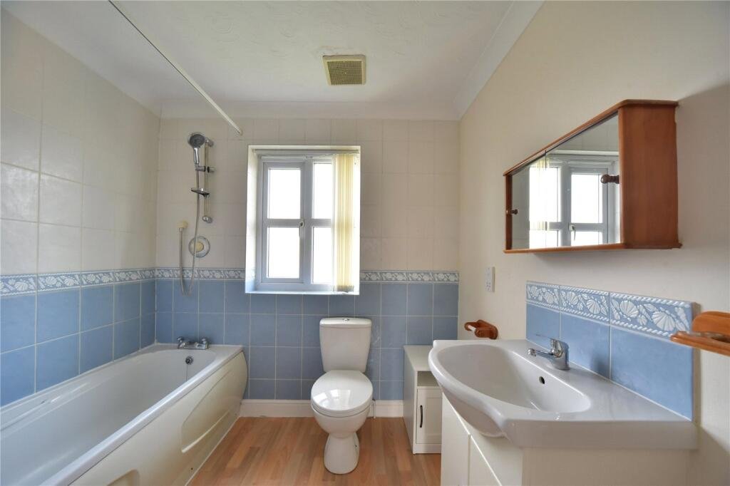 BATHROOM:Suite comprising of low level WC, handbasin with unit below, bath with shower over, window to rear.