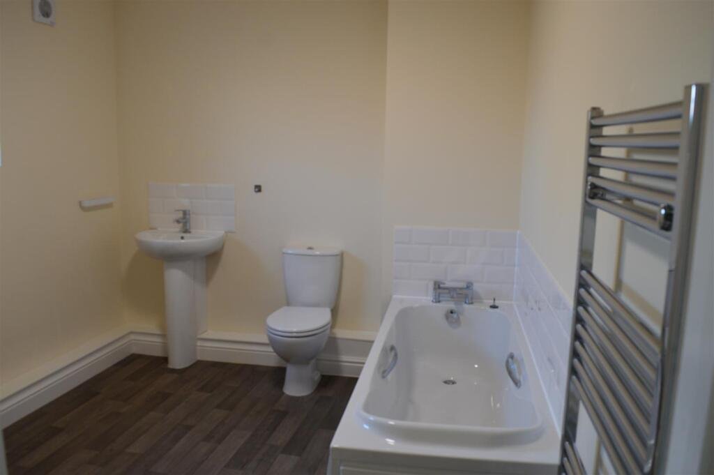 Bathroom – Window to Rear, Vinyl Flooring, Towel Rail Radiator, White Bath, White HWB, White W/C, Walk in Shower.