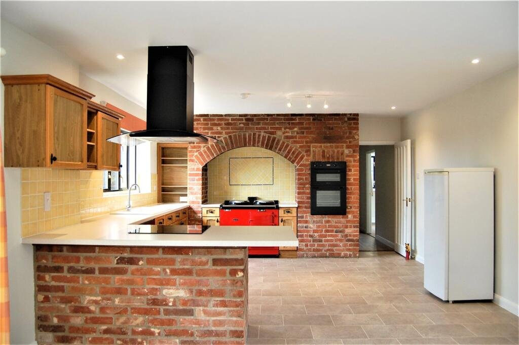 KITCHEN/BREAKFAST ROOM: 23’05 x 14’06 worksurfaces with cupboard fitted above and below, inset sink unit, brick area housing oil fired aga, integral dishwasher, built-in double oven, inset hob with extractor over. window to side aspect, door to side aspect, radiator.