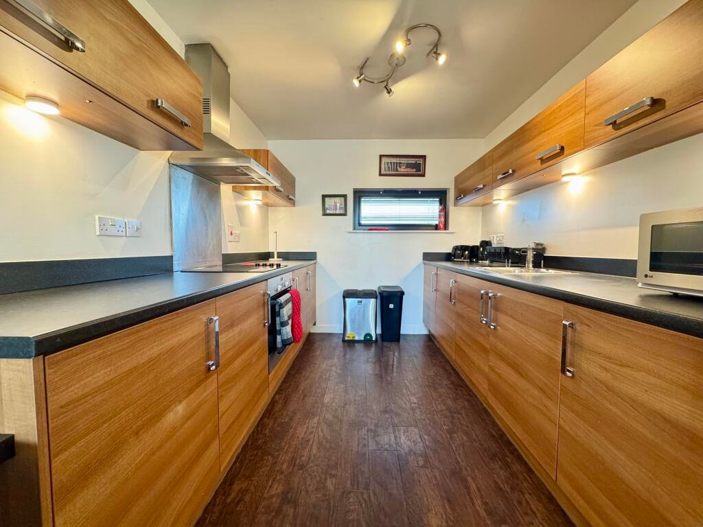 inset sink unit, integrated fridge/freezer, built in hob, built in oven washing machine, frosted window to front aspect and smooth plastered ceiling.
