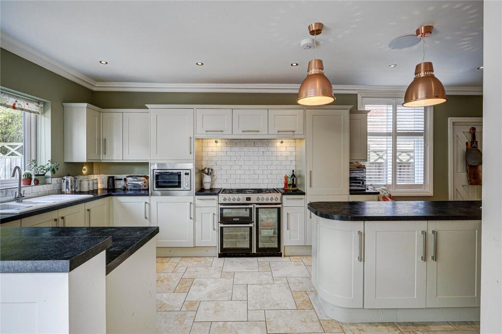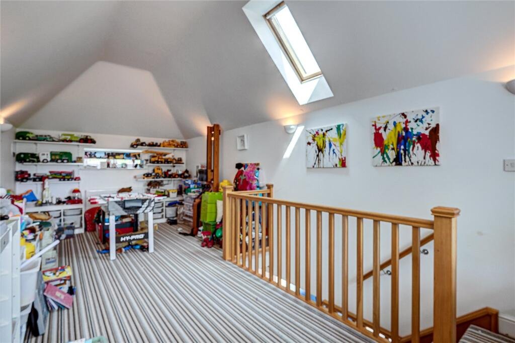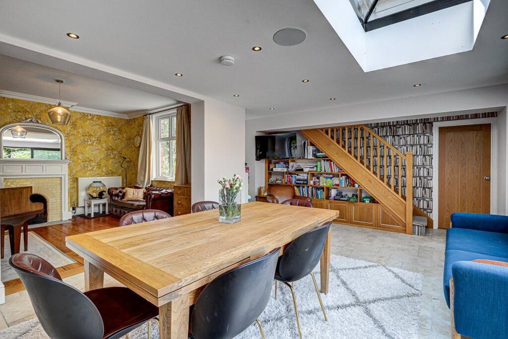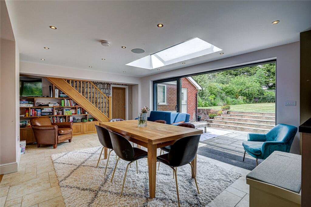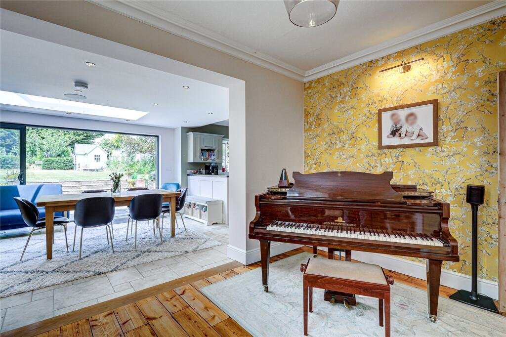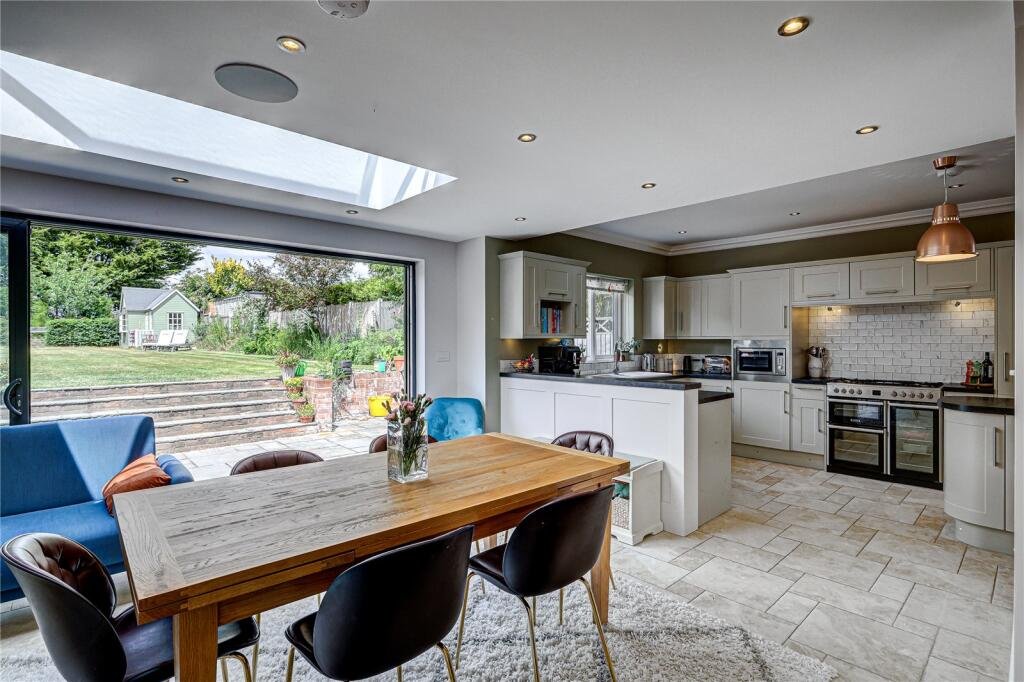 room with large bay window overlooking the front garden and a fireplace with log burner. The original dining room is now a sitting room / music room which leads seamlessly into the stunning kitchen extension. This room is flooded with natural light through the large sky lantern and sliding doors that fully open out to a patio terrace. The kitchen area is fitted with an extensive range of quality units incorporating integrated appliances along with an island. A utility cupboard provides an area for a washing machine to be hidden out of sight. There is plenty of space within the family / dining area to have a large dining table and seating which makes this a fantastic sociable space. An office / bedroom 5 is situated off the kitchen family room and oak stairs lead up to a playroom which could also be converted to a bedroom if required.