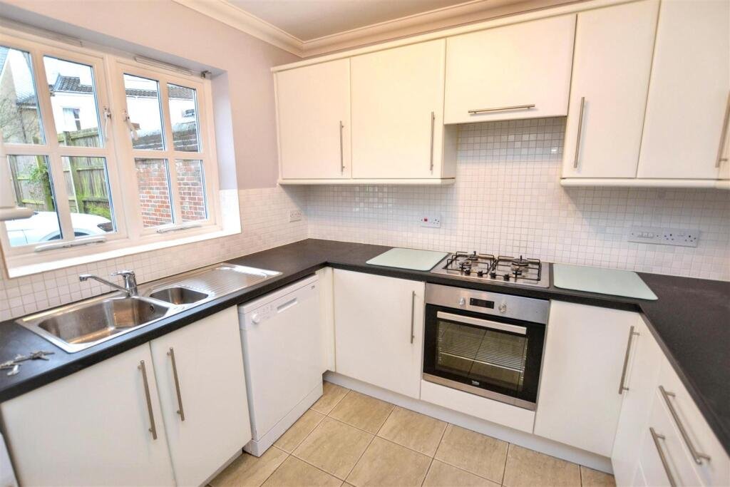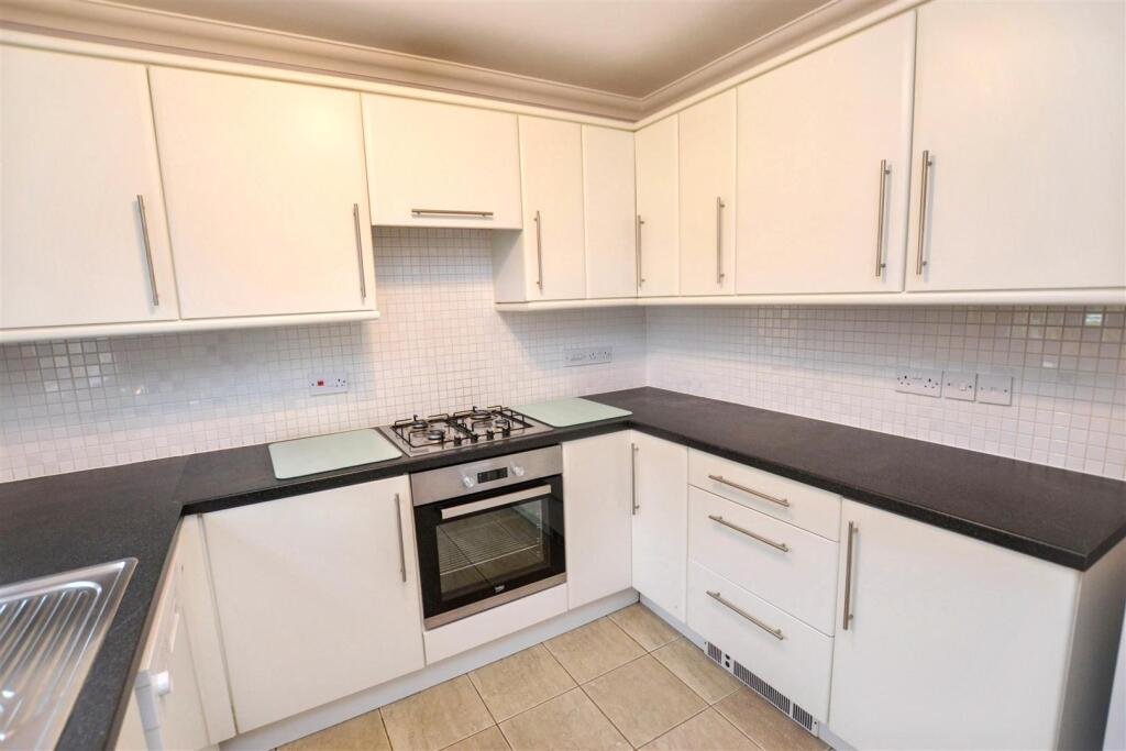Kitchen – 2.73m x 2.748m – A good range of modern base and wall units with ample work surfaces. Inset sink units and inset hob and oven. Tiled floor.