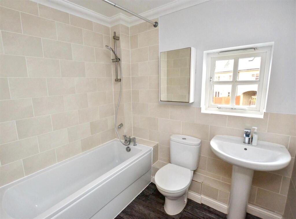Bathroom – 2.102m x 1.871m – Modern white suite with WC, wash basin and bath with shower over.