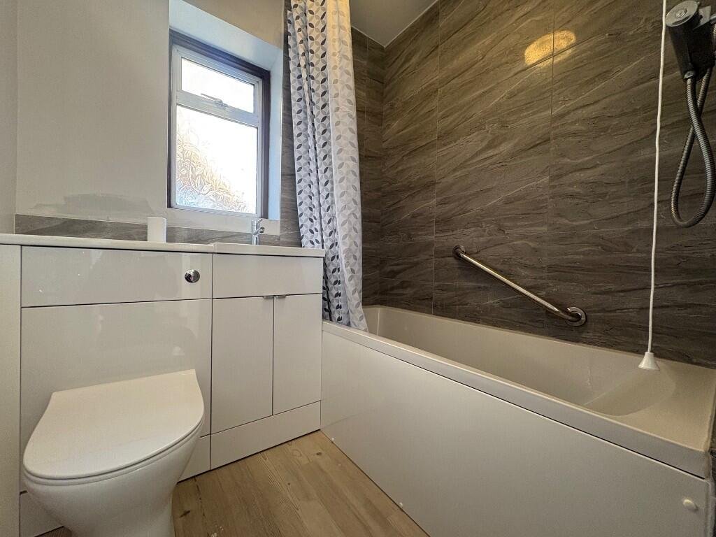 Good sized bathroom with matching white 3 piece suite consisting of WC, hand basin and bath with shower over