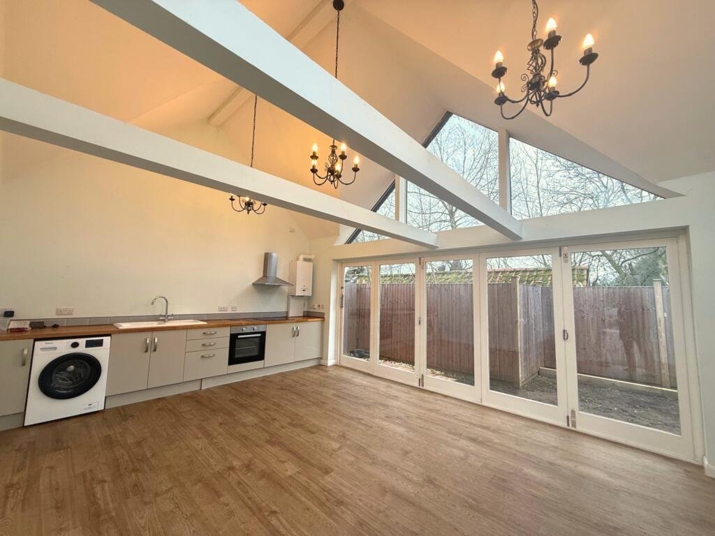 and exposed beams that create a wonderful sense of space. Large floor-to-ceiling windows and glazed doors flood the room with natural light and provide direct access to the private outdoor area. The open-plan layout incorporates a modern fitted kitchen complete with integrated oven, extractor hood, generous worktop space, and appliance areas, making it ideal for both everyday living and entertaining.The accommodation also includes two well-proportioned rooms finished with neutral décor, modern lighting, and quality flooring throughout, allowing tenants to move in and make the space their own with ease. The master bedroom also benefits from an en-suite shower room in addition to the family bathroom.Skylights throughout the property further enhance the bright and airy atmosphere.Outside we have a newly turfed area with patio to the rear. This property is available mid-March for a long-term occupancy. Call now to register your interest![Stowmarket]