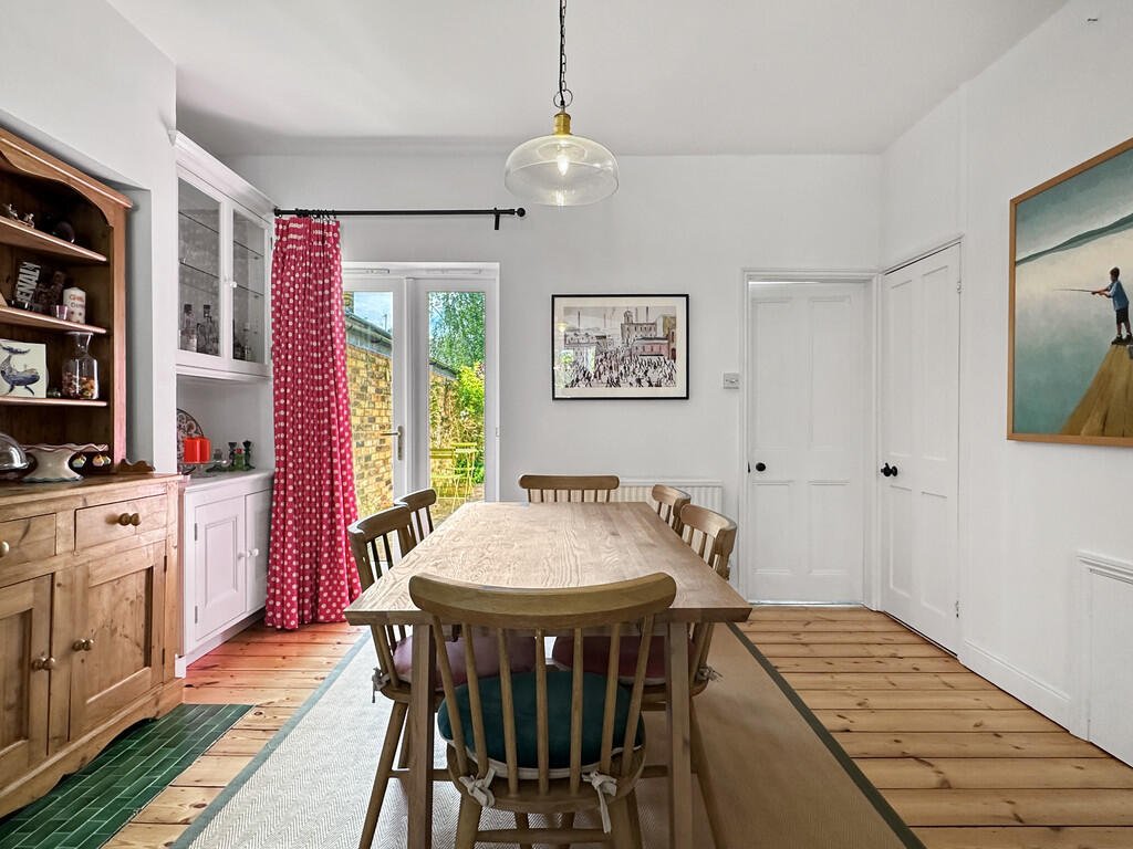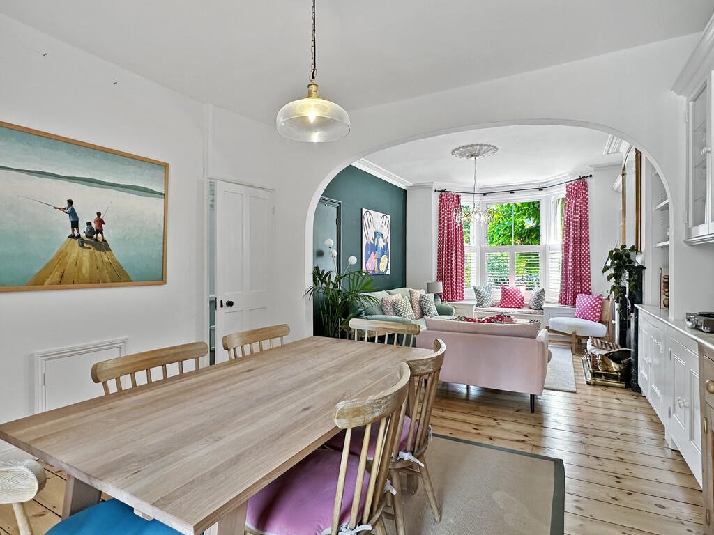 of the property. You are greeted with the characterful entrance corridor and reception hall, fitted with original treated wooden floorboards that continue into the living and dining area. Complete with large bay window and seating area. There is built in display storage and alcoves on either side of the feature cast-iron fireplace. Access leads to the side terrace, via an external door.